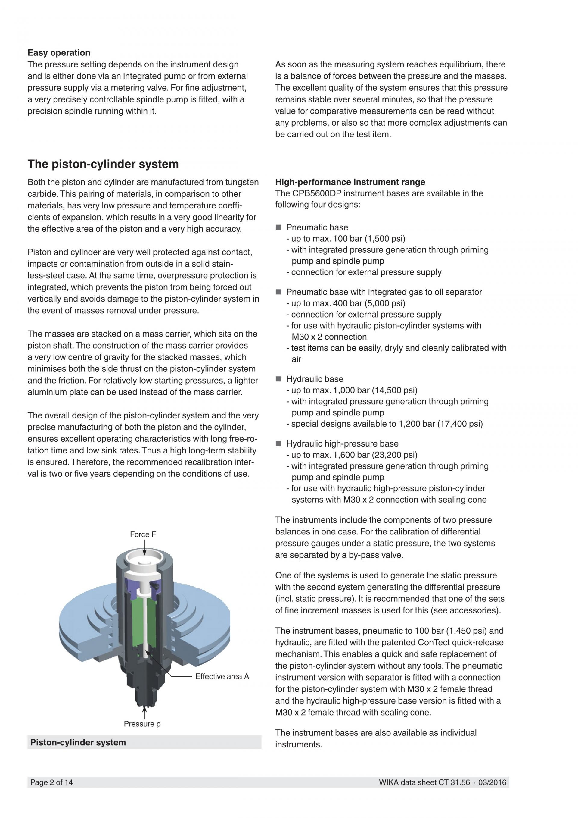 압력은 힘과 면적값으로 정의됩니다. 따라서 압력 밸런스 CPB5600DP의 핵심 구성 요소는 매우 정밀하게 제조된 피스톤 - 실린더 시스템으로 개별 하중을 가하여 개별 테스트 포인트를 생성합니다.