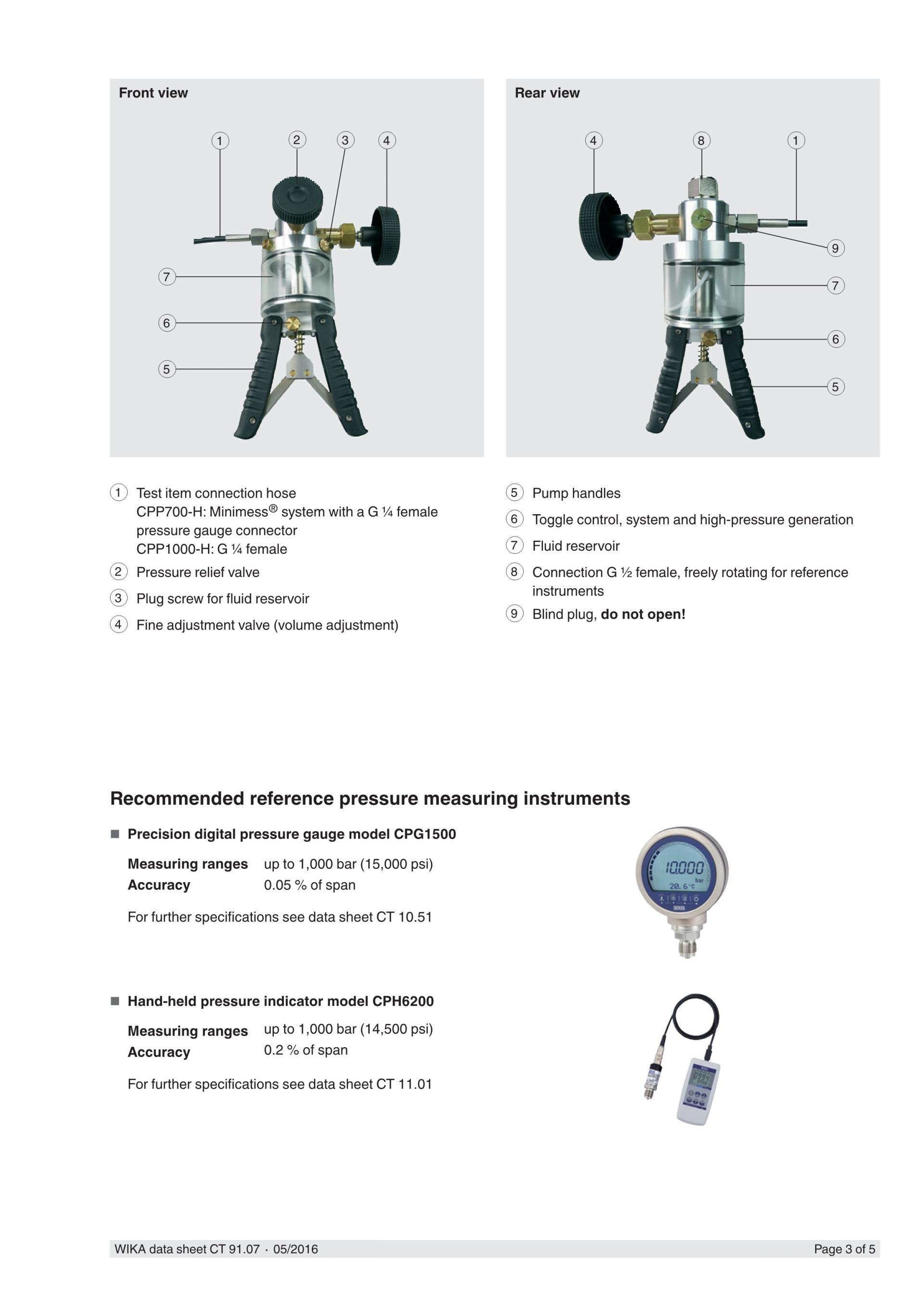 기준 장비는 펌프의 상단에 직접 나사로 조이고 테스트 항목은 납품시 포함 된 G ¼ 암나사의 연결 호스를 사용하여 연결됩니다. CPP700-H는 Minimess® 1620 테스트 항목 호스 시스템과 함께 제공됩니다.