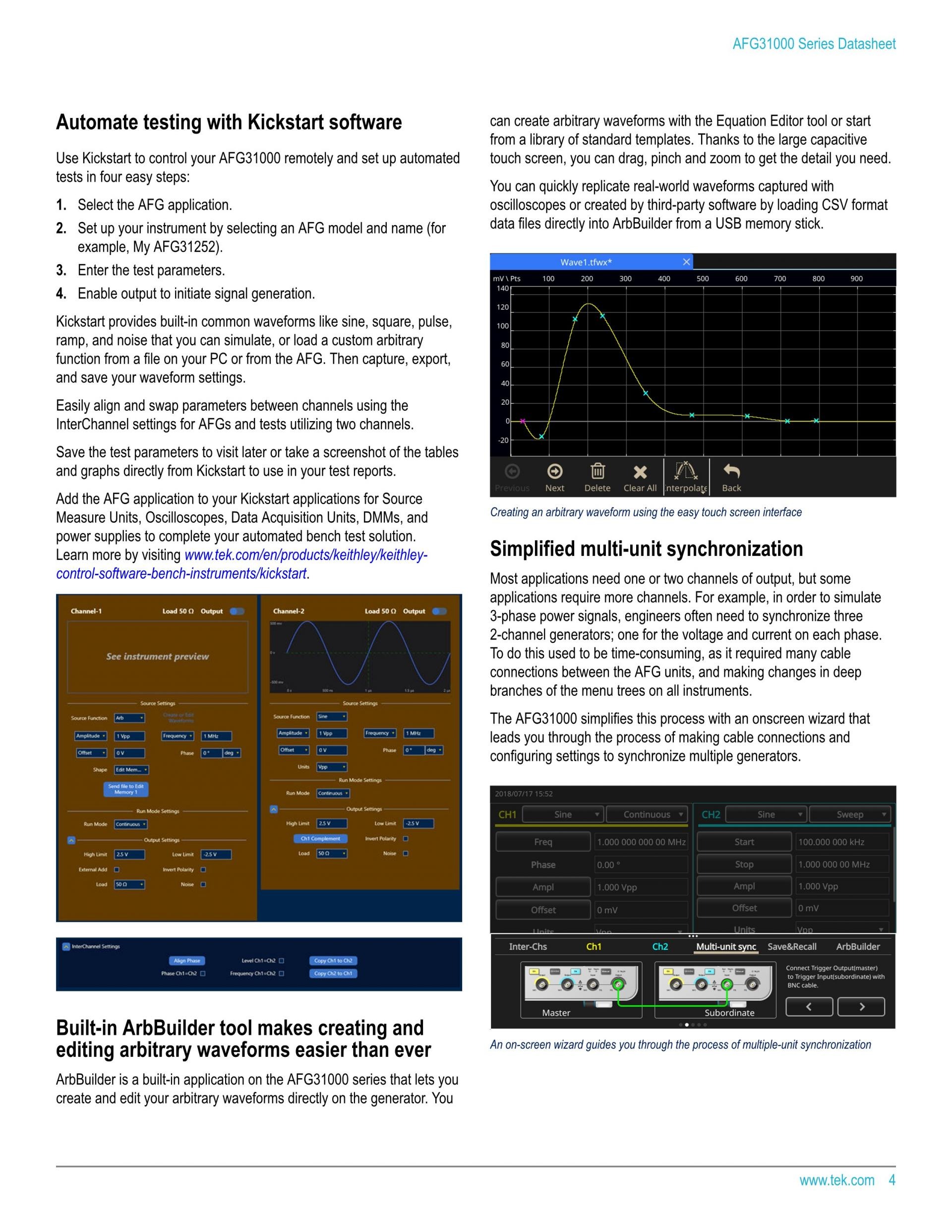 최신 시스템의 다양한 신호를 테스트 하는 것은 복잡하고 어렵게 느껴집니다. 12개의 표준 파형, 임의 파형 기능, 신호 감쇠 옵션을 갖춘 AFG3000C 임의/함수 발생기 시리즈는 단일 측정 장비에서 많이 사용되는 매우 다양한 애플리케이션을 지원합니다. 동급 최고의 성능으로 신호의 정확한 재현을 보장합니다. AFG3000C 임의/함수 발생기 시리즈는 대형 디스플레이가 설치되어 있고 25개의 바로 가기 키가 제공되어 사용하기가 매우 쉽습니다.