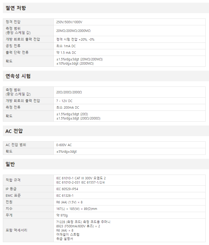 • IEC 61557에 따른 절연 시험시 최소 1mA의 전류 사용.