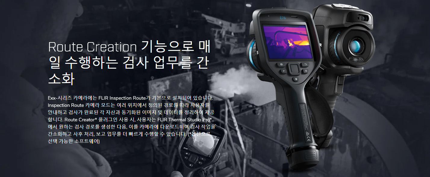FLIR E76은 대형 지붕을 검사하거나, 안전한 거리에서 전기 설비를 검사하는 작업에 활용 가능한 교환식 AutoCal™ 렌즈와 호환이 가능하기 때문에 근거리, 원거리에 관계없이 다양한 작업에 활용할 수 있습니다. FLIR E54에서 한 단계 업그레이드 된 E76에는 1000°C의 온도까지 측정 가능한 옵션을 추가할 수 있고, 레이저 지원 오토 포커스 기능과 3개의 구역 측정용 박스를 이용해 정확한 온도 측정이 가능합니다. 320 × 240의 해상도를 갖춘 디텍터는 온도를 정확하게 측정할 수 있게 도와주고, 부가적인 세부 디테일과 원근감을 더해줄 수 있는 FLIR 특허 기술인 MSX® 기술은 더욱 선명하고 생생한 이미지를 제공해줍니다. 카메라에 설치된 FLIR Inspection Route 기능은 사전에 계획된 검사 경로를 따라 검사를 할 수 있게 해주기 때문에 규모가 크거나, 검사 대상이 여러 위치에 분산된 시설을 검사할 때, 보다 체계적으로 검사를 수행할 수 있게 도와줍니다. 기간 한정으로 진행되는 특별 프로모션 기간에 E76 카메라를 구매할 경우, FLIR Thermal Studio Pro와 FLIR Route Creator를 3개월 간 무료로 사용해 보실 수 있습니다.