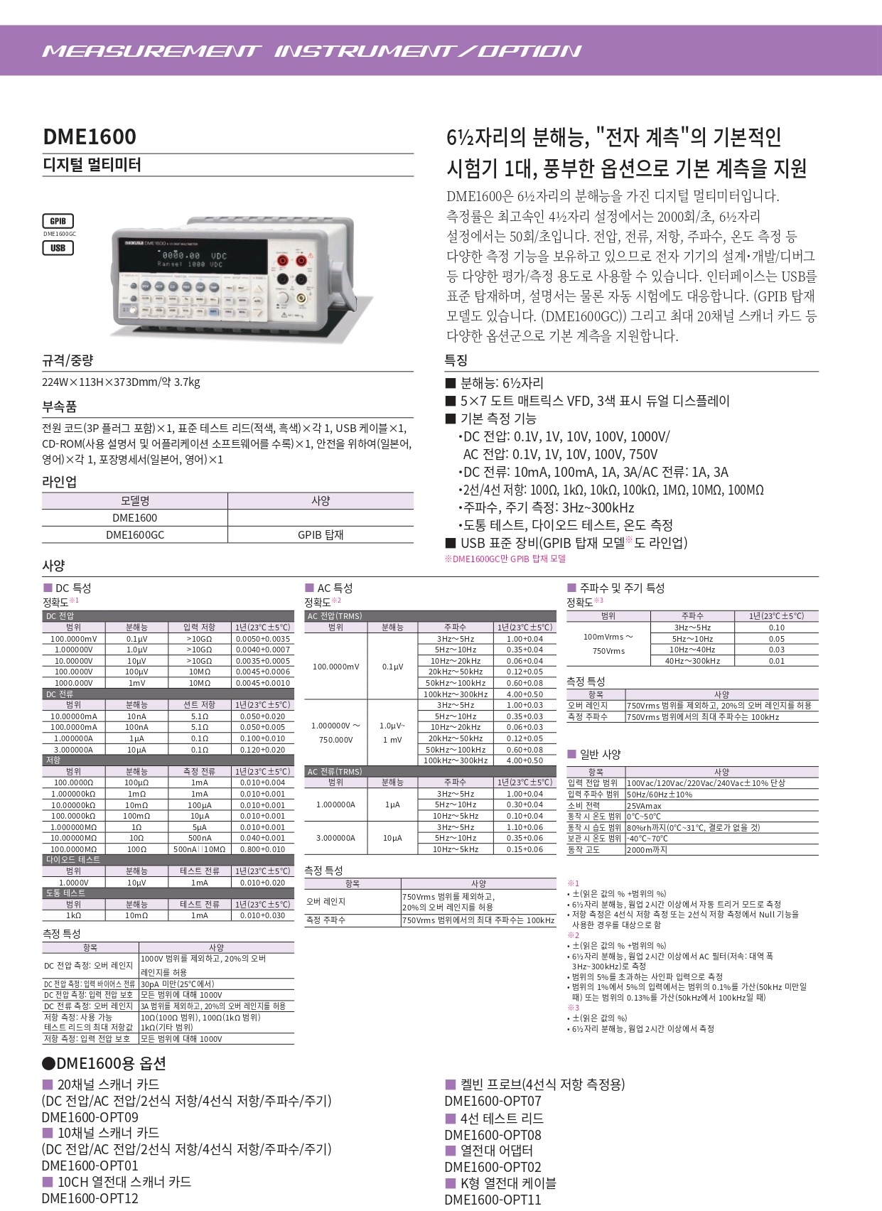 | DME1600 | 6 1/2자릿수의 분해능을 지닌 디지털 멀티미터, , DC 전압::0.1V - 1000V, AC 전압:0.1V - 750V, DC 전류:10mA - 3A, AC 전류:1A - 3A, 2선/4선 저항:100Ω - 100MΩ, 주파수, 주기 측정:3Hz - 300kHz, 도통 테스트, 다이오드 테스트, 온도 측정, USB를 표준 장비 |