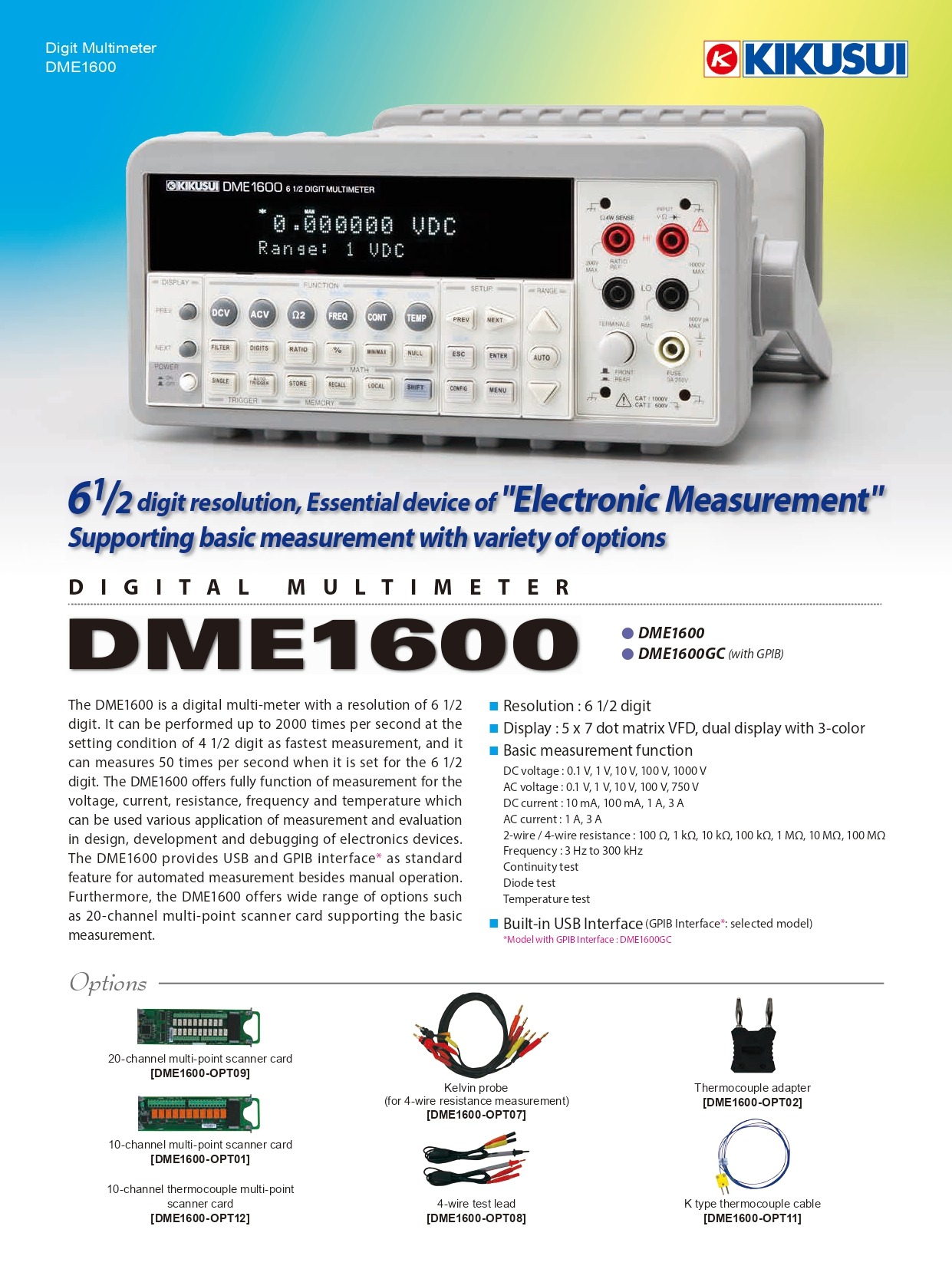 DME1600은 6 1/2자릿수의 분해능을 지닌 디지털 멀티미터입니다. 측정 비율은 가장 고속인 4 1/2사릿수 설정으로는 2000회/초, 6 1/2자릿수 설정으로는 50회/초입니다. 전압, 전류, 저항, 주파수, 온도 측정 등 풍부한 측정기능을 보유하고 있으므로 일렉트로닉스 기기의 설계・개발/디버그 등, 다양한 평가/측정용도에 사용하실 수 있습니다. 인터페이스는 USB와 GPIB(DME1600GC)를 표준 탑재하며, 매뉴얼은 물론 자동시험에도 대응합니다. 또한 최대 20채널 스캐너 카드 등 풍부한 옵션군으로 기본 계측을 서포트합니다.