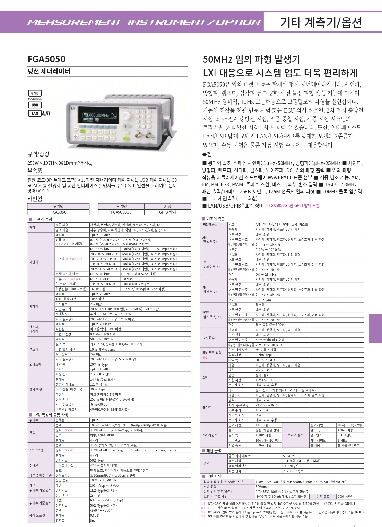 | FGA5050GC | 임의파형기능을 탑재한 50MHz 펑션 제너레이터, 정현파, 방형파, 램프파, 삼각파, 펄스파, 노이즈파, DC, 임의파형 출력, 임의파형 작성용 어플리케이션 소프트웨어WAVEPATT 표준 첨부, 각종 변조기능AM, FM, PM, FSK, PWM, 주파수 스위프, 버스트, 외부 변조 입력, 16비트/50MHz 패턴 출력, 14비트/256K포인트, 125M 샘플/s, 10MHz 클럭 입출력, 트리거 입출력(TTL 호환), LAN/USB/GPIB표준 장비 |