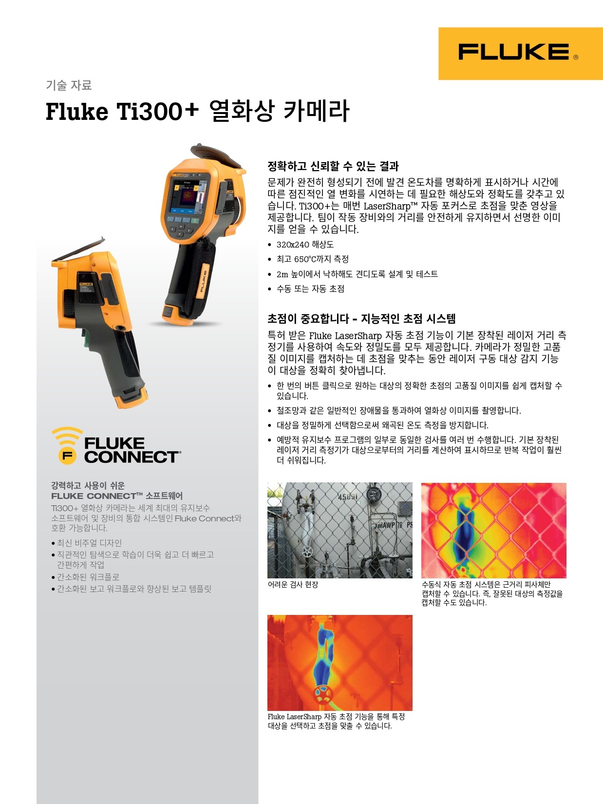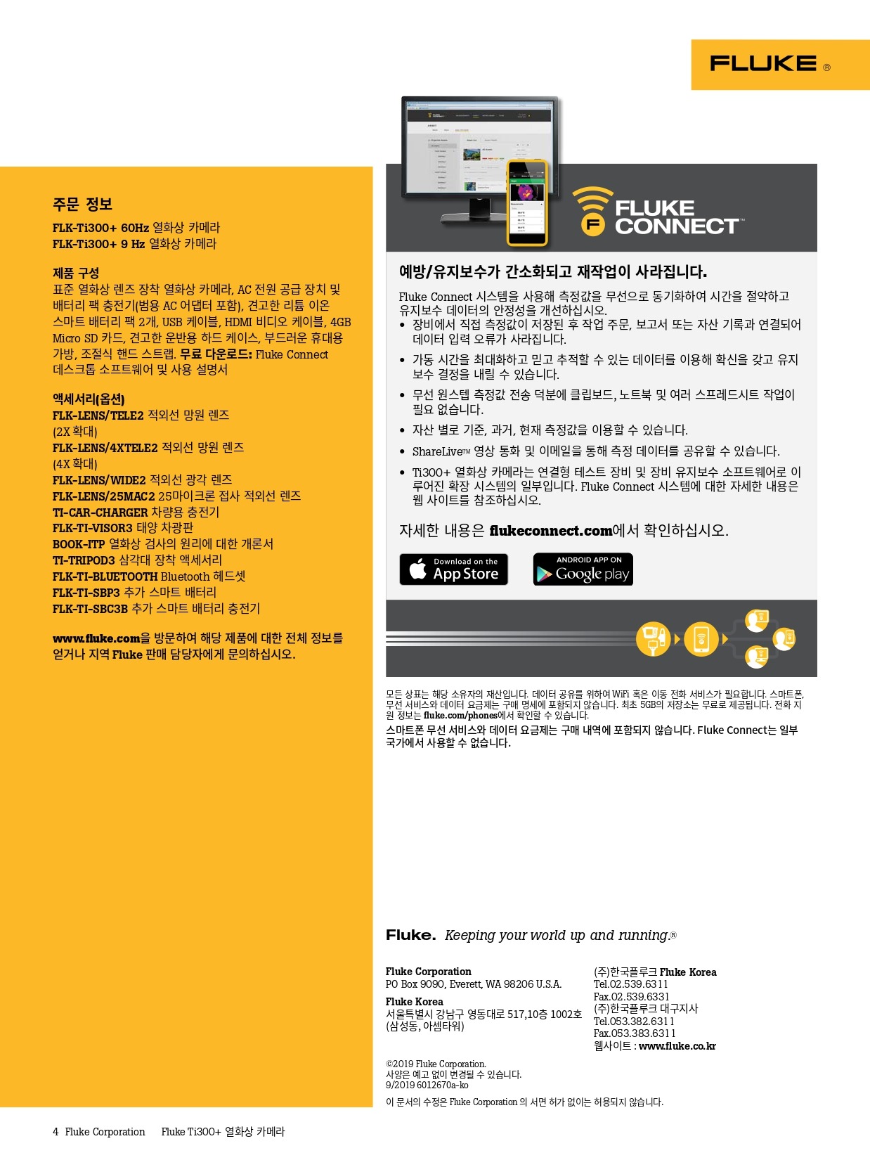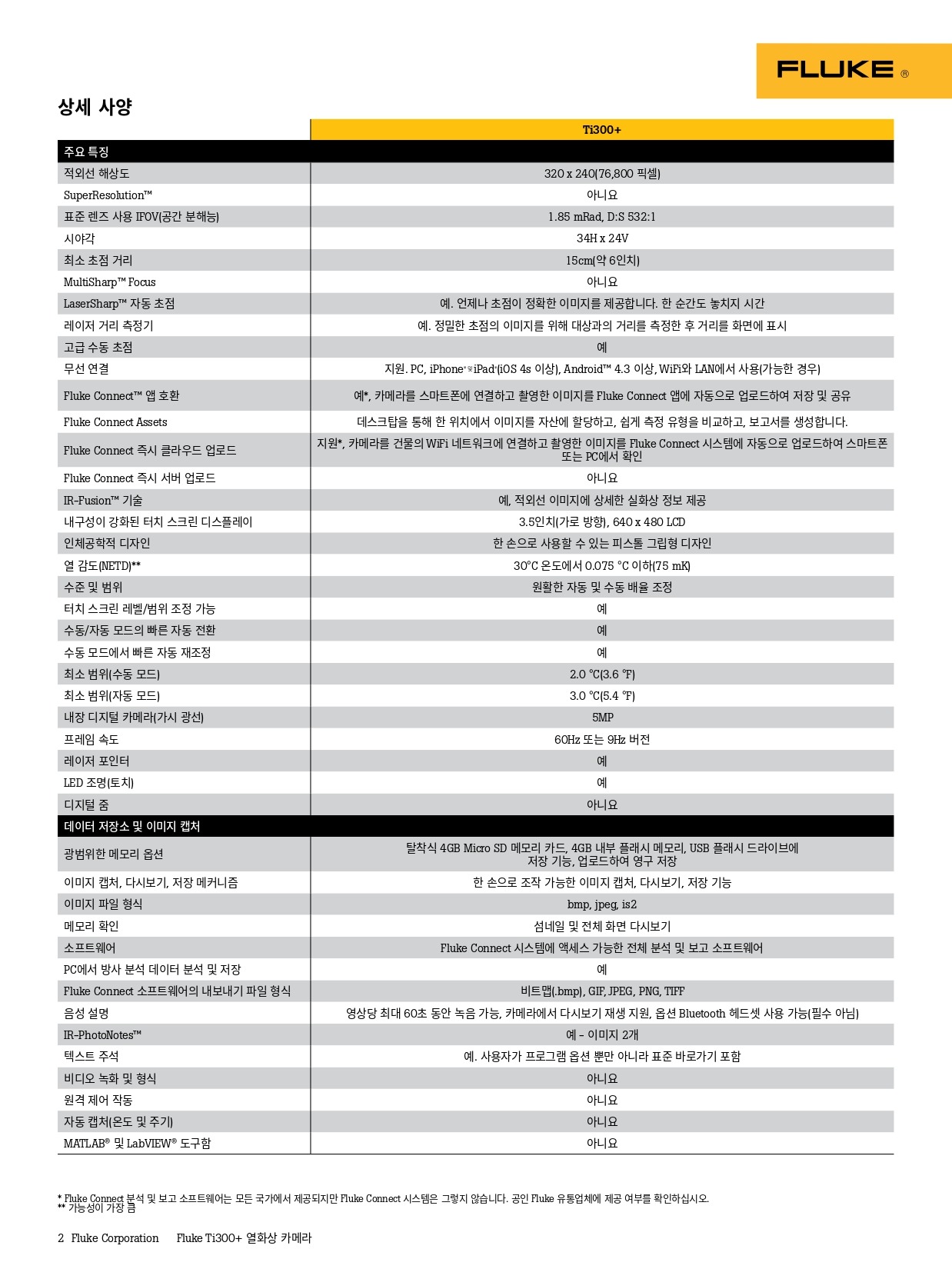 | Fluke Connect® 앱 호환 | 예*, 카메라를 스마트폰에 연결하고 촬영한 이미지를 Fluke Connect 앱에 자동으로 업로드하여 저장 및 공유 |