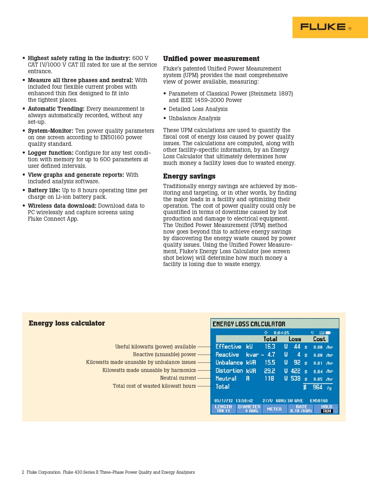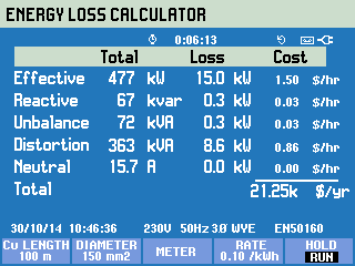 · 에너지 손실 계산기: 기본적인 유효 및 무효 전력 측정 외에 불균형 및 고조파 전력을 정량화하여 에너지 손실의 금전적 비용을 계산합니다.