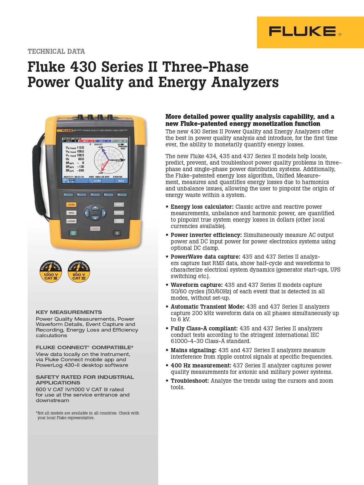 Fluke 435 II 전력 품질 및 에너지 분석기는 시설을 위한 보험과 마찬가지입니다. 시설에 어떤 문제가 발생하더라도 435 II가 있으면 쉽게 대처할 수 있습니다. 향상된 전력 품질 측정 기능 및 금전적 정량화 기능을 통해 전기와 관련된 중요한 문제들을 모두 처리할 수 있습니다.