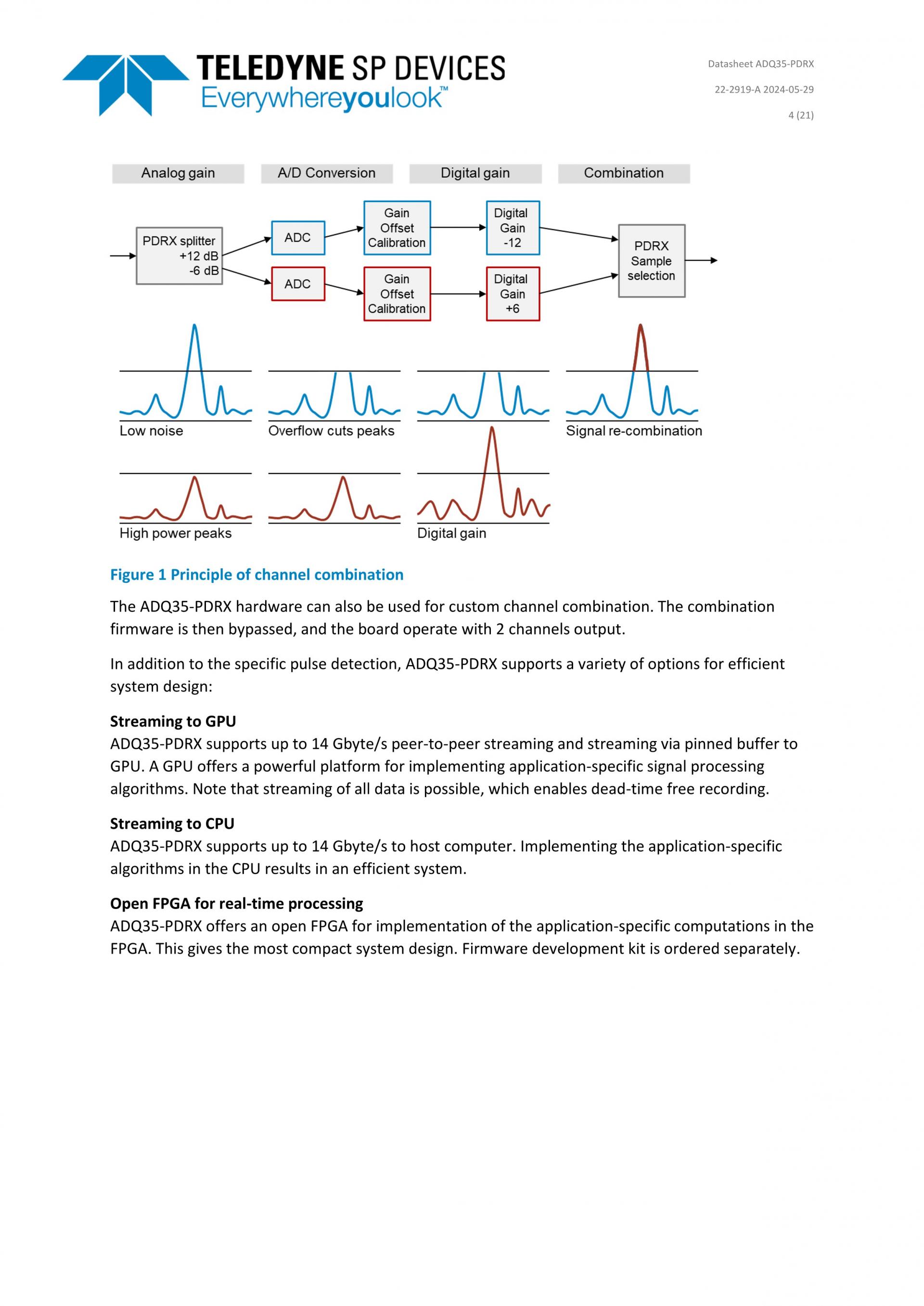 The ADQ35-PDRX includes all features of ADQ35 including high-speed data streaming, open FPGA, extensive software suite, advanced triggering and clocking, general-purpose input/output (GPIO), and more. More information about PDRX is available here: