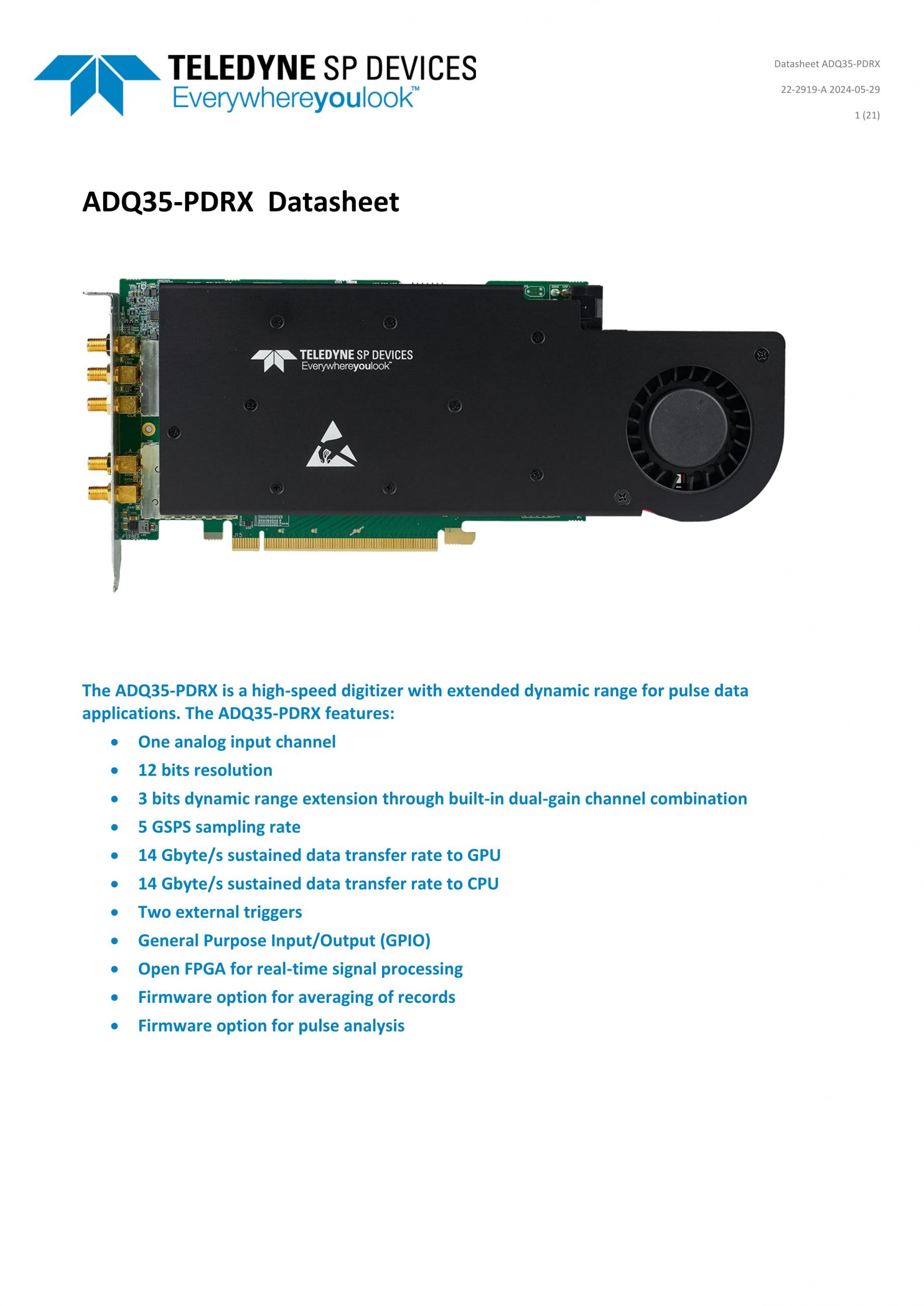 SP DEVICES ADQ35-PDRX High-performance 12-bit, 5 GSPS digitizer for pulse data systems