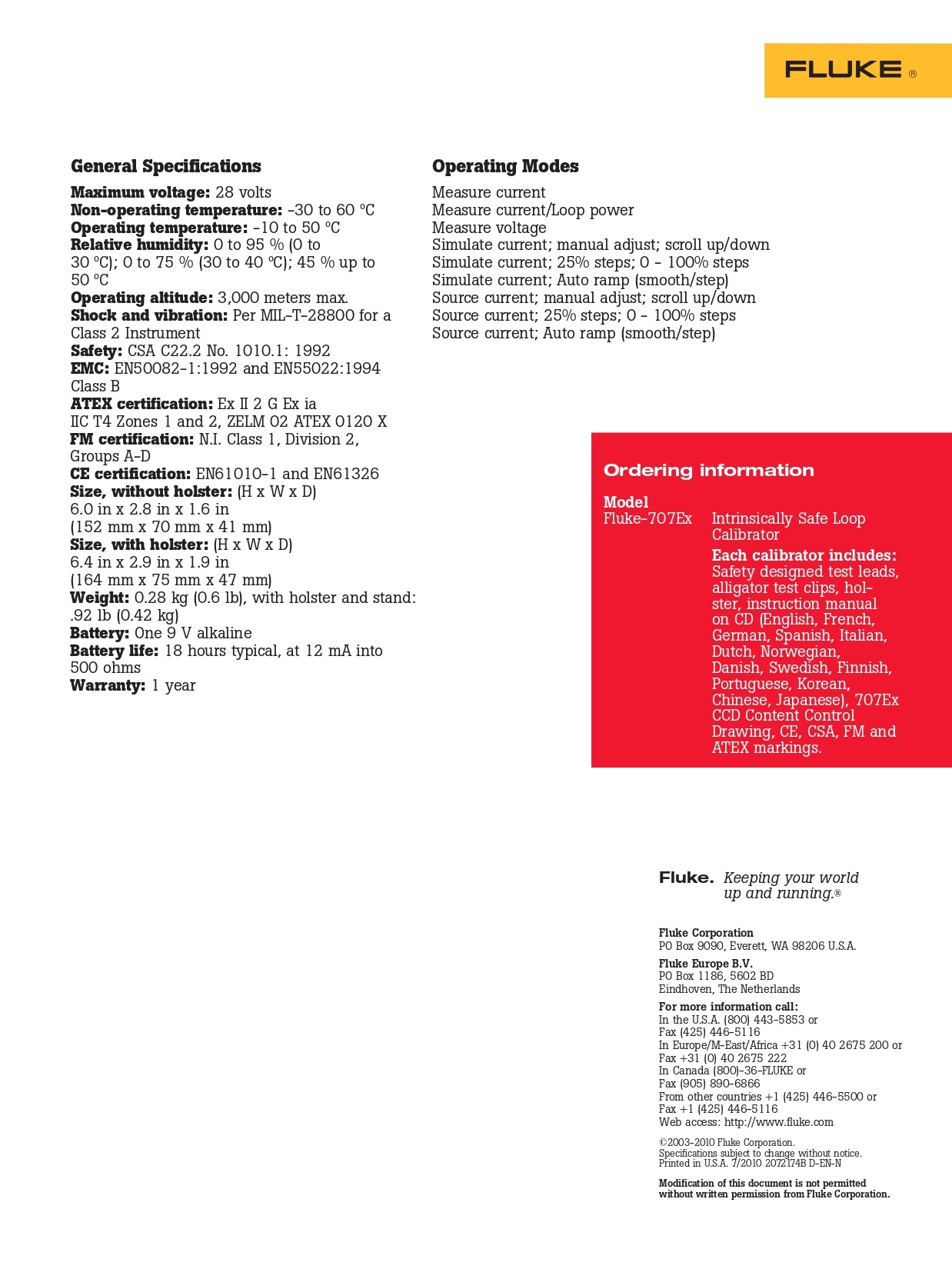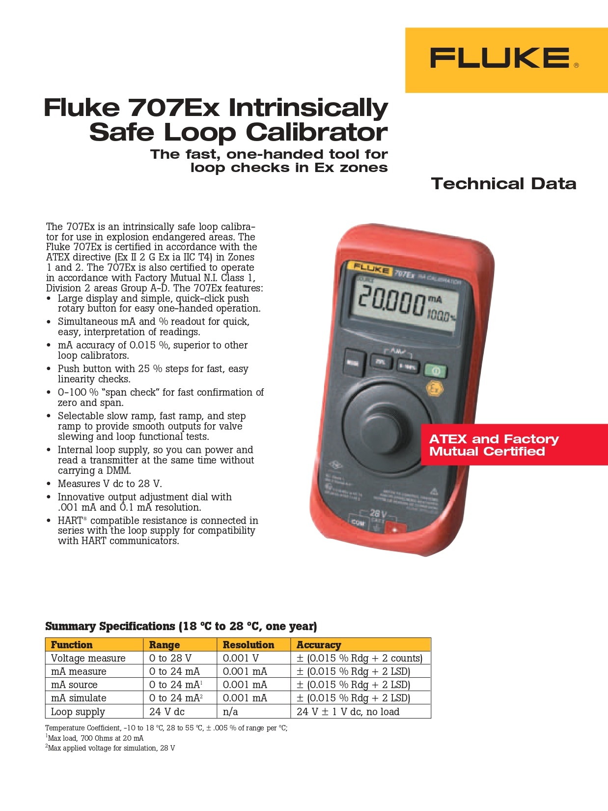 707Ex는 폭발 위험 구역에서 사용할 수 있는 본질 안전 루프 교정기입니다. Fluke 707Ex는 Zone 1 및 2에서 ATEX directive(Ex II 2 G Ex ia IIC T4) 인증을 받았습니다.