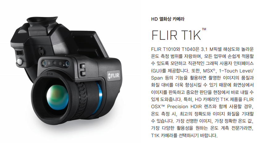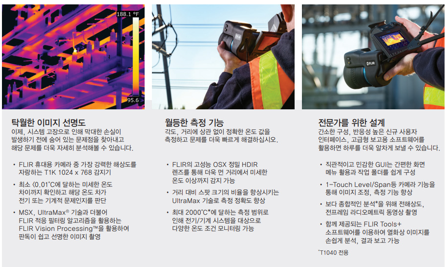 최고 수준의 선명도를 갖춘 이미지부터 정확한 온도 정보, 가장 우수한 활용성을 제공하는 T1040은 FLIR가 지난 50년 간 적외선 분야에서 축적한 경험을 바탕으로 개발한 역대급 결과물입니다.