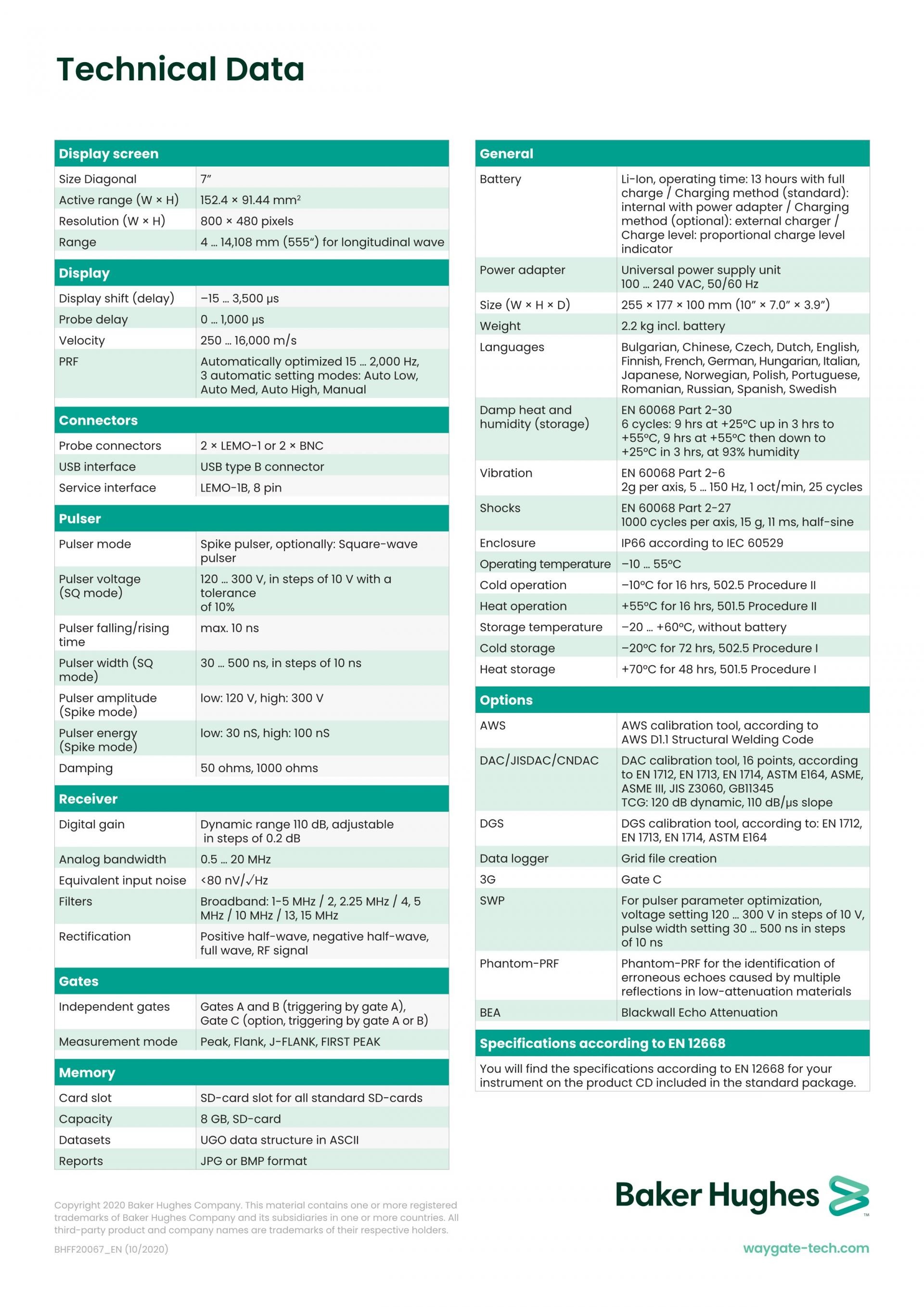 다용도 기기는 가장 표준적인 검사 코드를 충족하기 위해 세 가지 버전으로 제공됩니다. 가장 진보된 버전은 DAC, AWS 및 DGS 모드에서 작동할 수 있고, 우수한 재료 침투를 위한 강력한 구형파 펄스 장치를 특징으로 하며, DGS 방법을 사용하여 결함 크기에 있어 타의 추종을 불허하는 정확도를 제공하는 Waygate Technologies의 특허 trueDGS 프로브 기술을 수용할 수 있습니다 . 특허 받은 팬텀 에코 감지 기술도 포함됩니다.