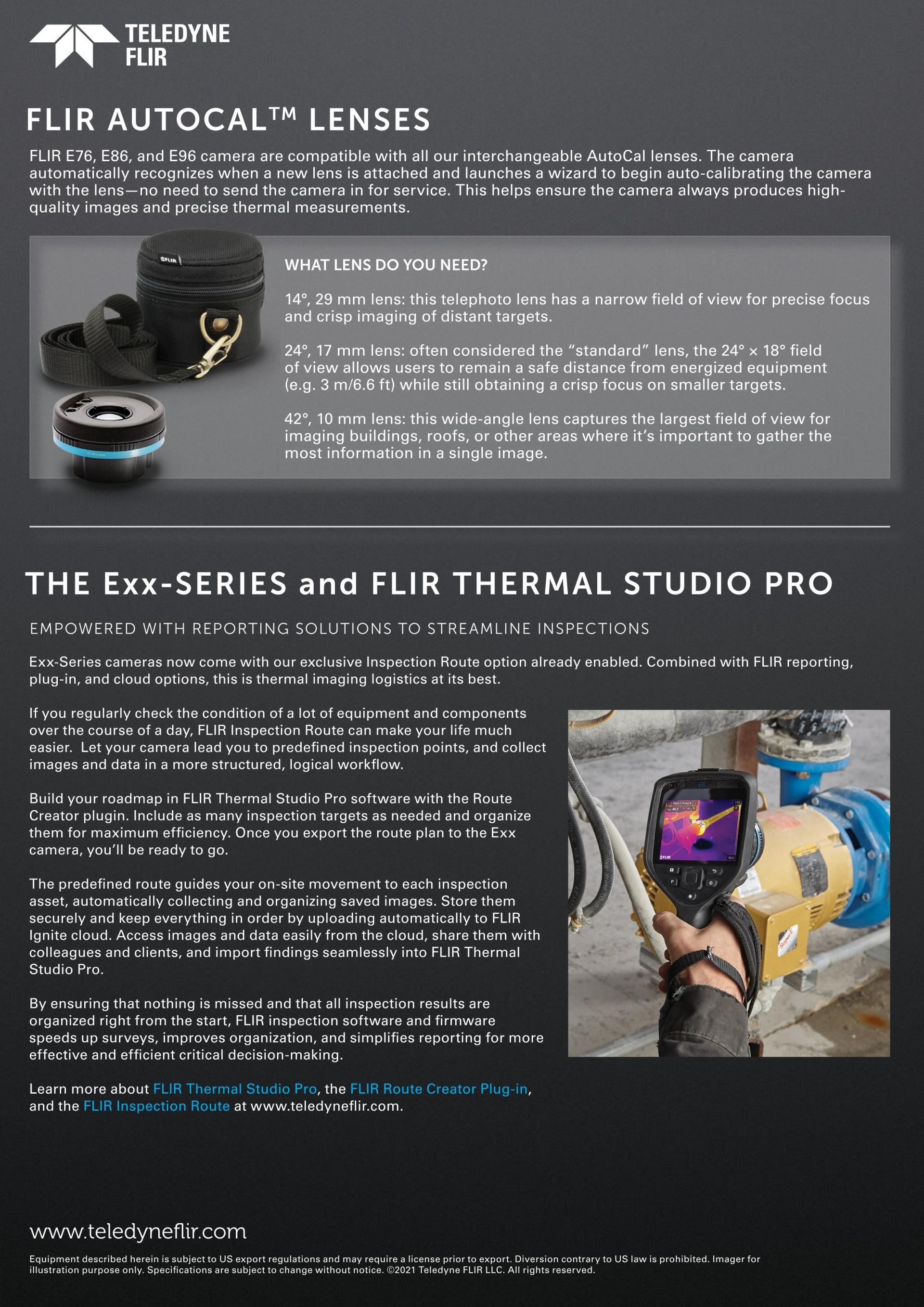 Exx-시리즈 카메라에는 FLIR Inspection Route가 기본으로 설치되어 있습니다. Inspection Route 카메라 모드는 여러 위치에서 정의된 경로를 따라 사용자를 안내하고 검사가 완료된 각 자산과 동기화된 이미지 및 데이터를 정리하여 제공합니다. Route Creator* 플러그인 사용 시, 사용자는 FLIR Thermal Studio Pro*에서 원하는 검사 경로를 생성한 다음, 이를 카메라에 다운로드하여 검사 작업을 간소화하고 사후 처리, 보고 업무를 더 빠르게 수행할 수 있습니다. (*옵션으로 선택 가능한 소프트웨어)
