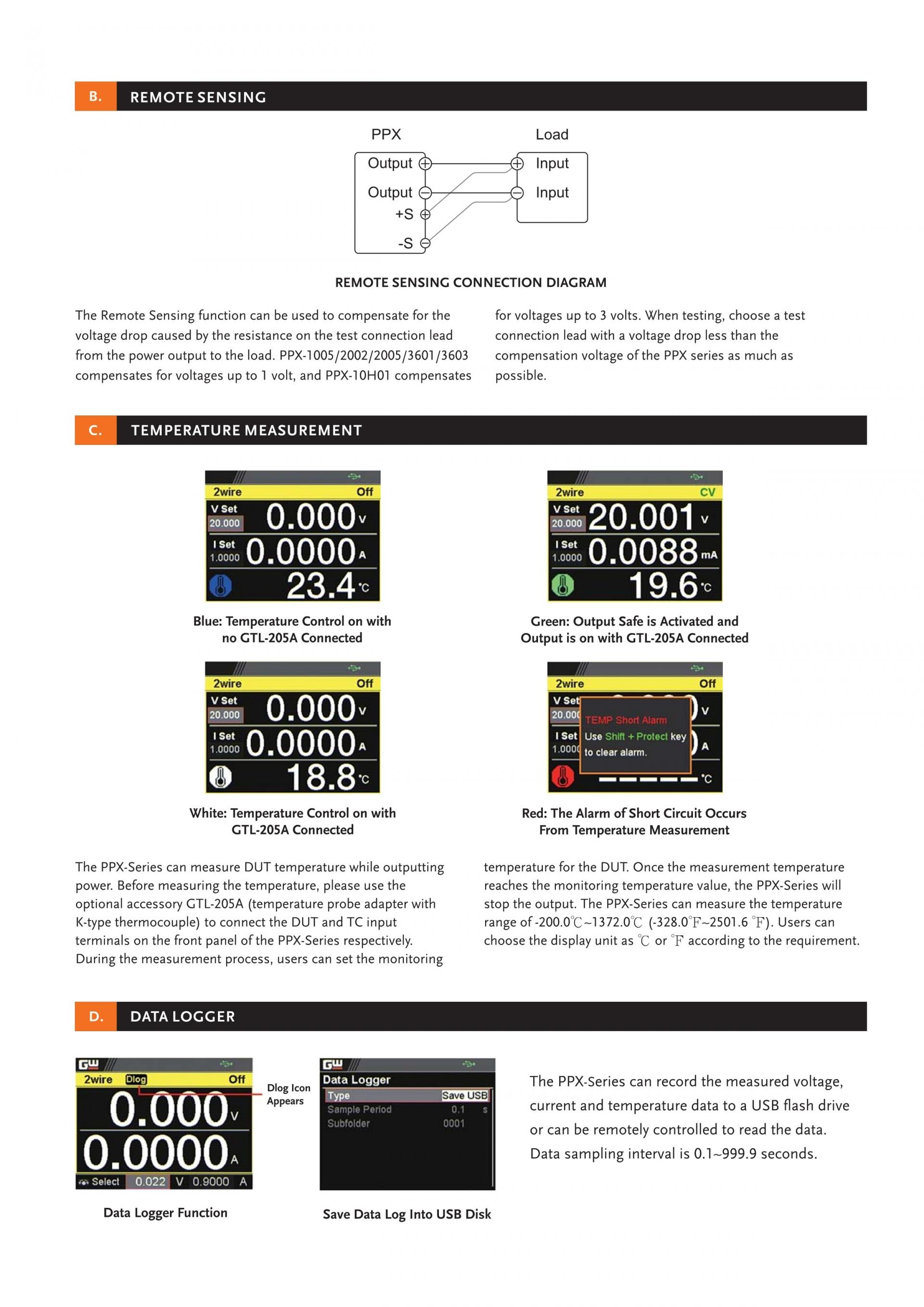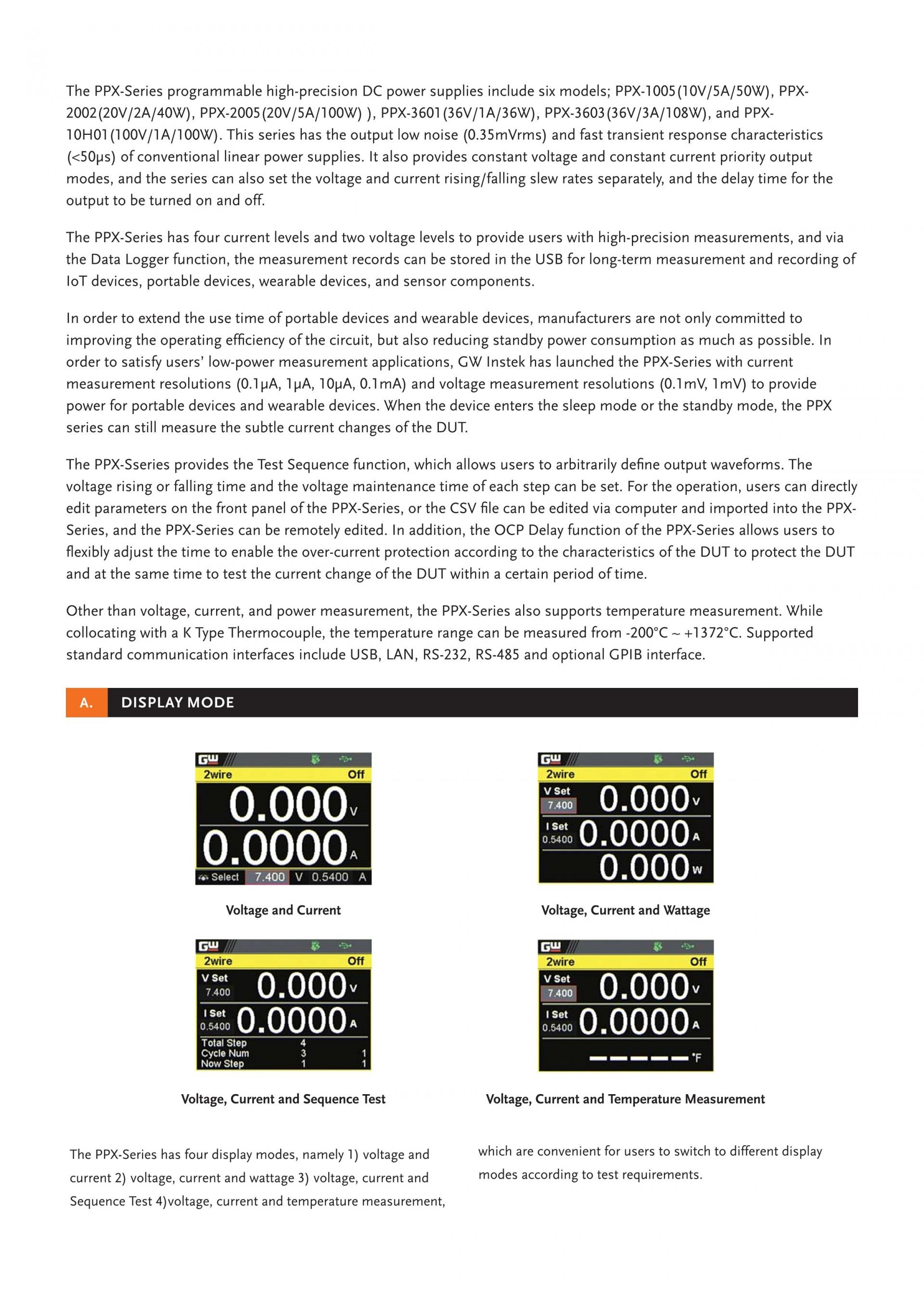 The PPX series has four current levels and two voltage levels to provide users with high-precision measurements, and via the Data Logger function, the measurement records can be stored in the USB for long-term measurement and recording of IoT devices, portable devices, wearable devices, and sensor components.