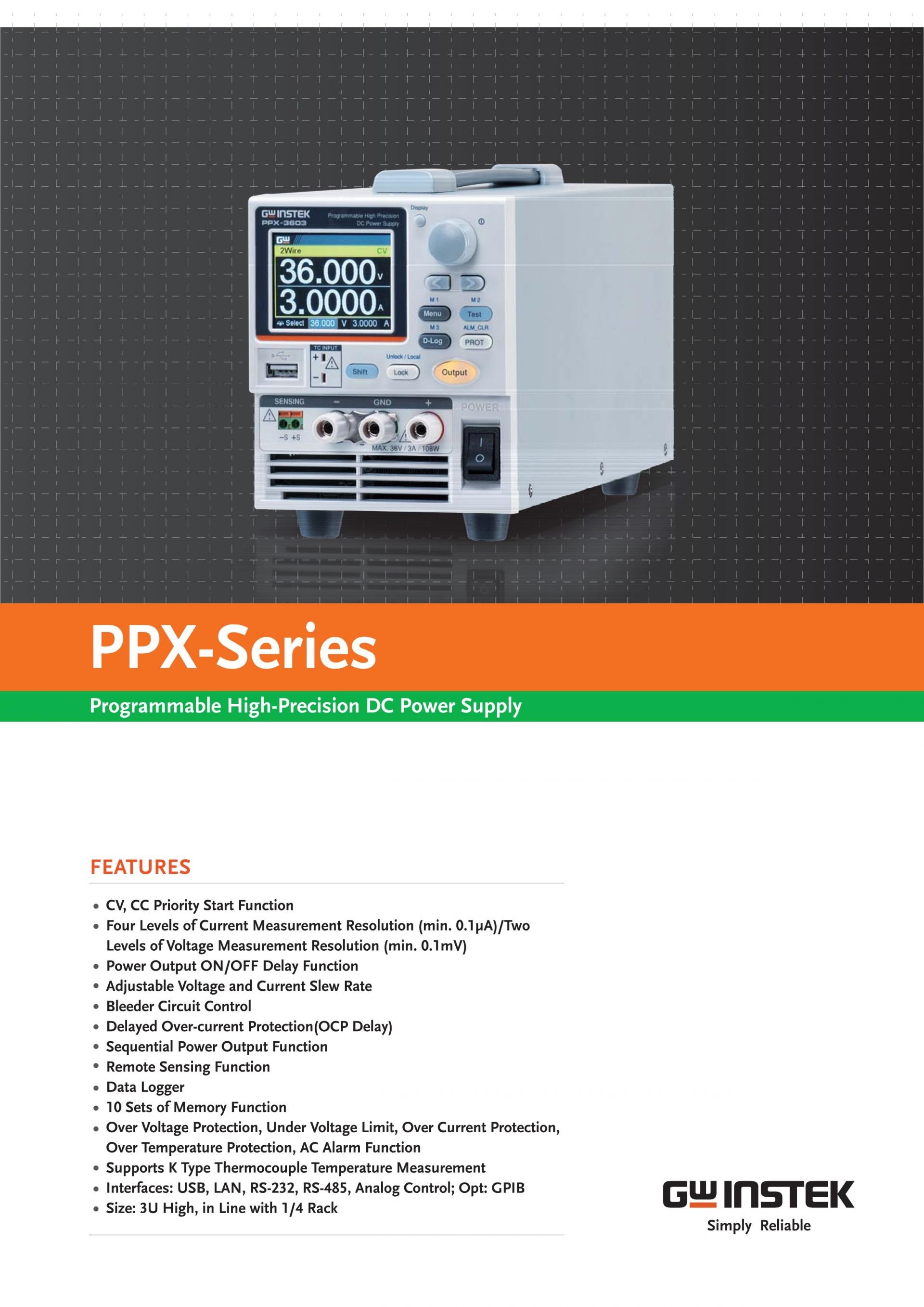 The PPX series programmable high-precision DC power supplies include six models; PPX- 1005(10V/5A/50W), PPX-2002(20V/2A/40W), PPX-2005(20V/5A/100W) ), PPX- 3601(36V/1A/36W), PPX-3603(36V/3A/108W), and PPX-10H01(100V/1A/100W). This series has the output low noise (0.35mVrms) and fast transient response characteristics (<50μs) of conventional linear power supplies.