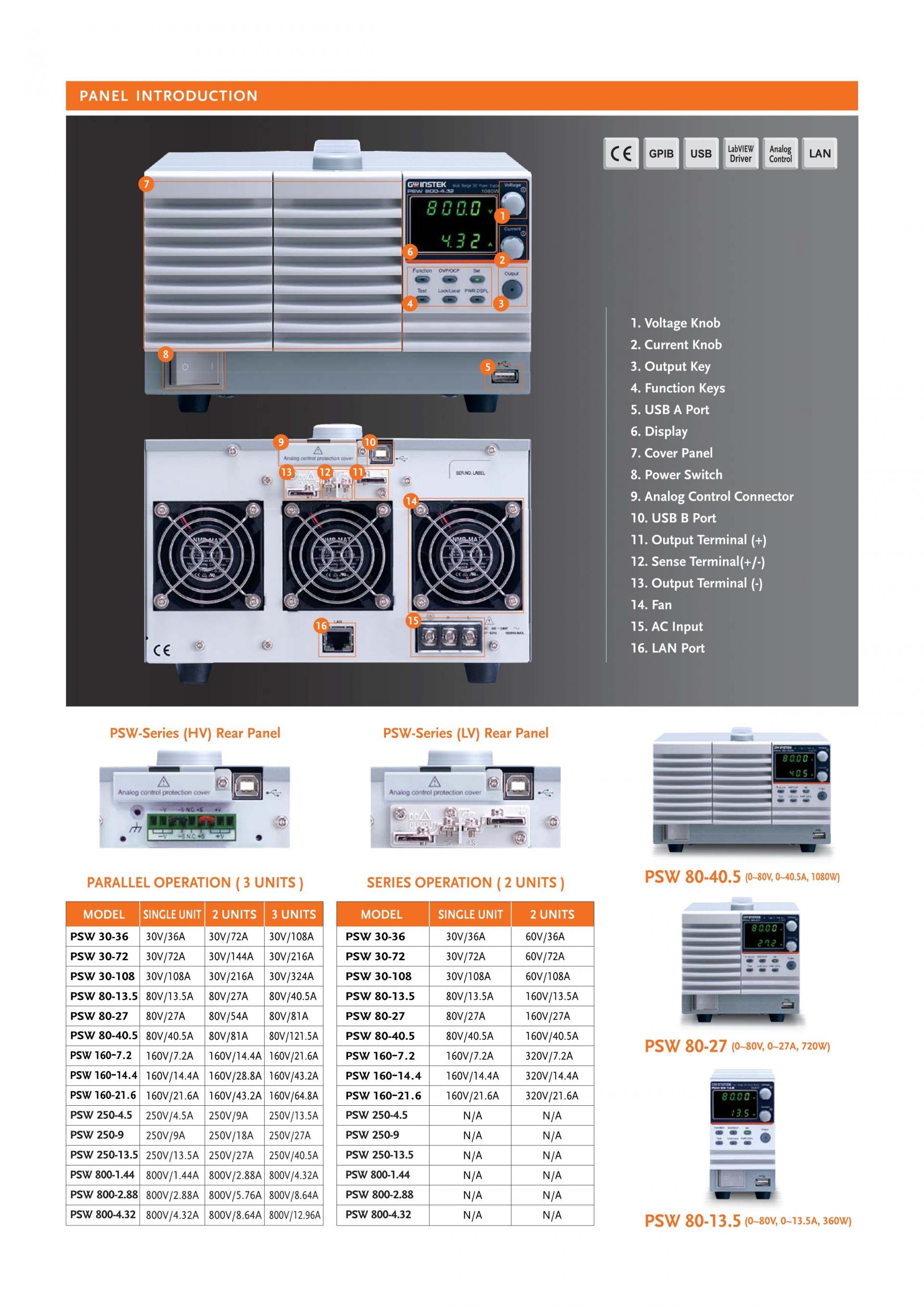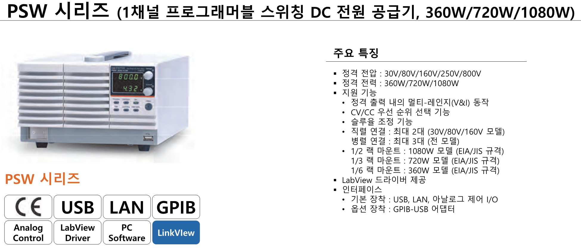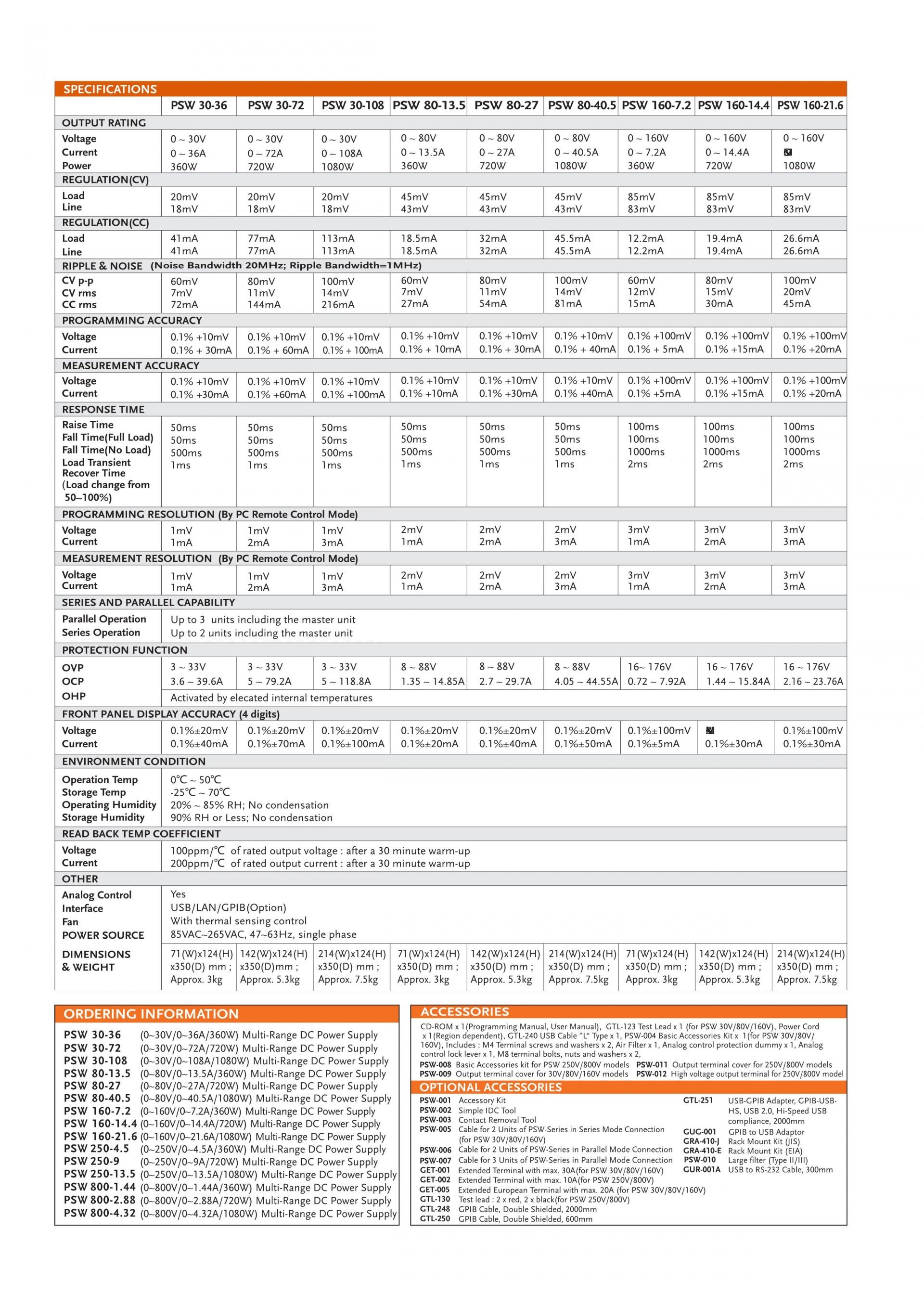 The PSW-Series is a single-output multi-range programmable switching DC Power Supply covering a power range up to 1080W. This series of products include fifteen models with the combination of 30V, 80V, 160V, 250V, and 800V rated voltages and 360W, 720W and 1080W maximum output powers. The multi-range feature allows the flexible and efficient configuration of voltage and current within the rated power range.