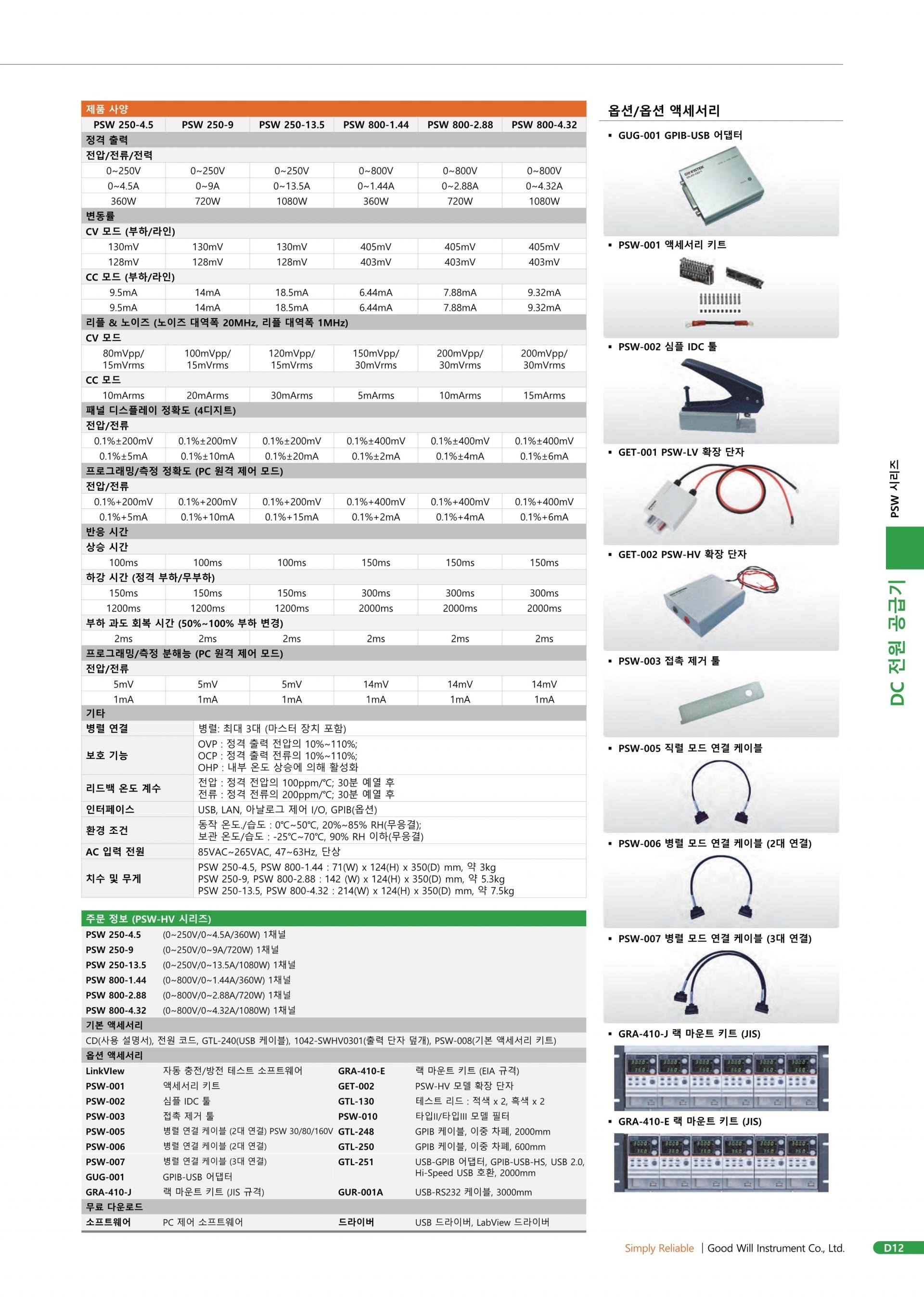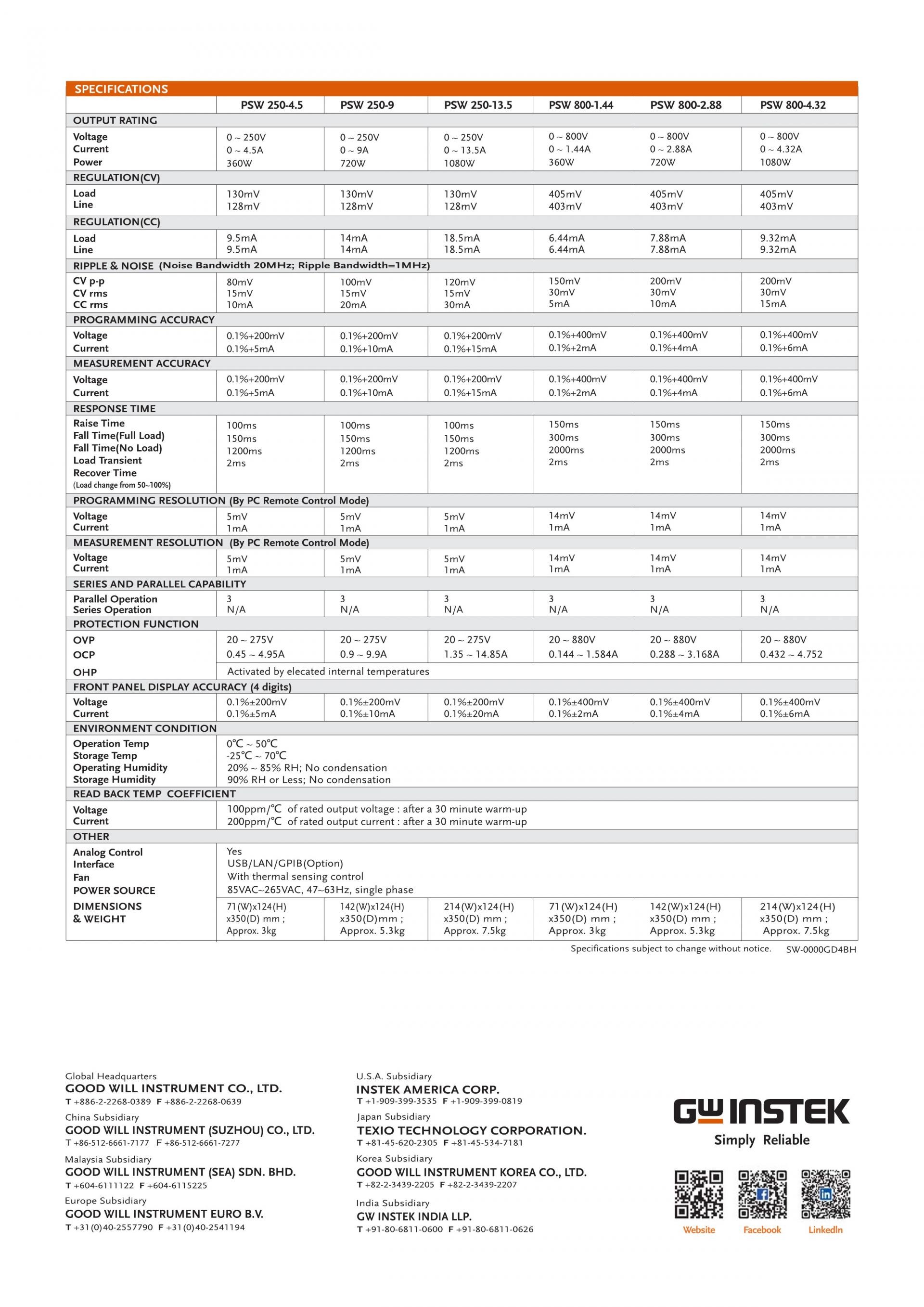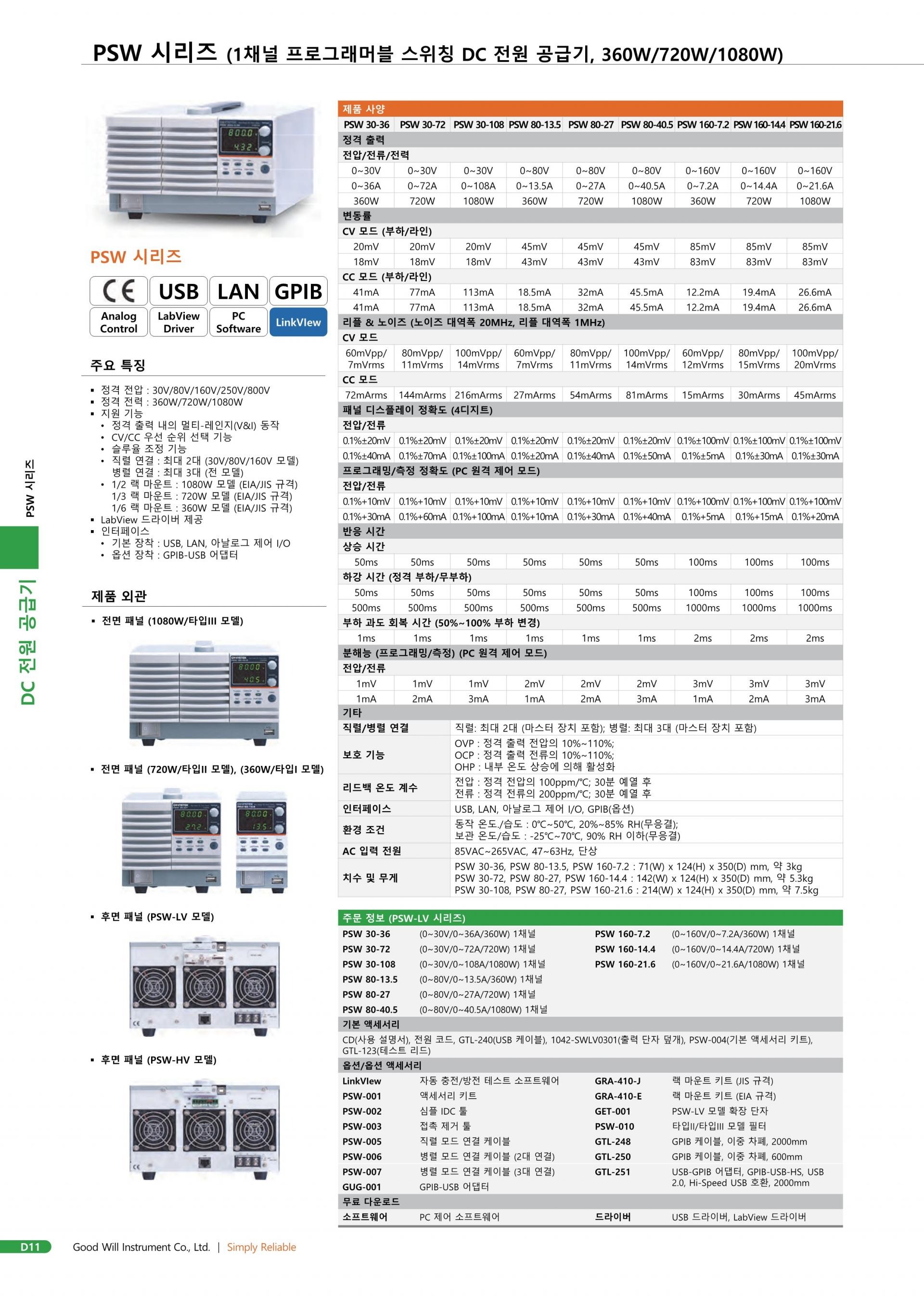 The PSW-Series is a single-output multi-range programmable switching DC Power Supply covering a power range up to 1080W. This series of products include fifteen models with the combination of 30V, 80V, 160V, 250V, and 800V rated voltages and 360W, 720W and 1080W maximum output powers. The multi-range feature allows the flexible and efficient configuration of voltage and current within the rated power range.