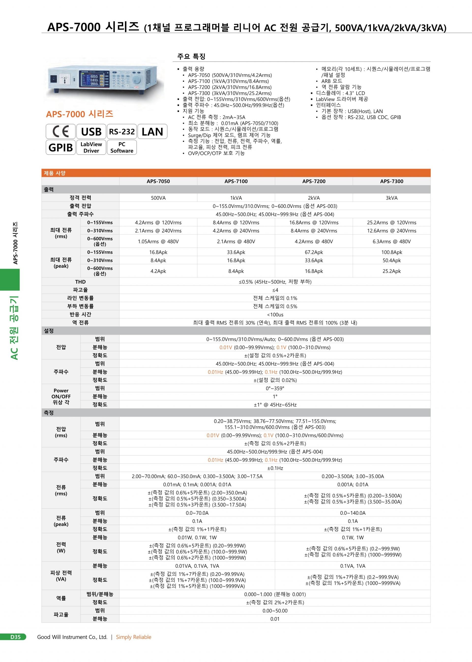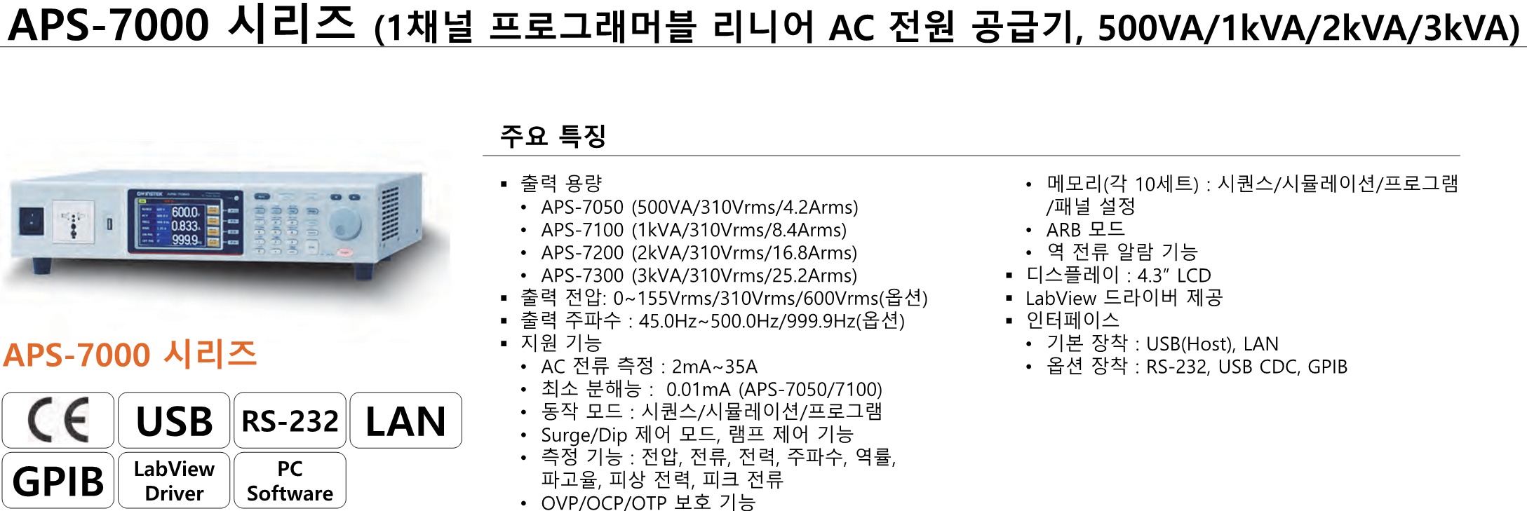 GWInstek은 500VA APS-7050, 1000VA APS-7100, 2000VA APS-7200, 3000VA APS-7300으로 구성된 APS-7000 시리즈 프로그래머블 AC 전원을 소개합니다. APS-7000 시리즈는 저잡음, 저 THD, 고안정된 전원 출력을 포함하는 선형 구조 설계로 저잡음 요구 사항 또는 스테레오, 비디오 및 오디오 장치 응용 프로그램 등의 제품 개발 및 입력 전원 검증에 이상적인 전원 특성을 갖추고 있습니다. 최대 정격 전압은 0~310Vrms, 25.2Arms, 100.8A 피크 전류이며 출력 주파수 범위는 45~500.0Hz입니다. 사용자는 GW Instek에 장비를 다시 보내지 않고도 옵션을 구매하여 출력 전압을 0Vrms에서 600Vrms로, 출력 주파수를 45Hz에서 999.9Hz로 편리하게 늘릴 수 있습니다.