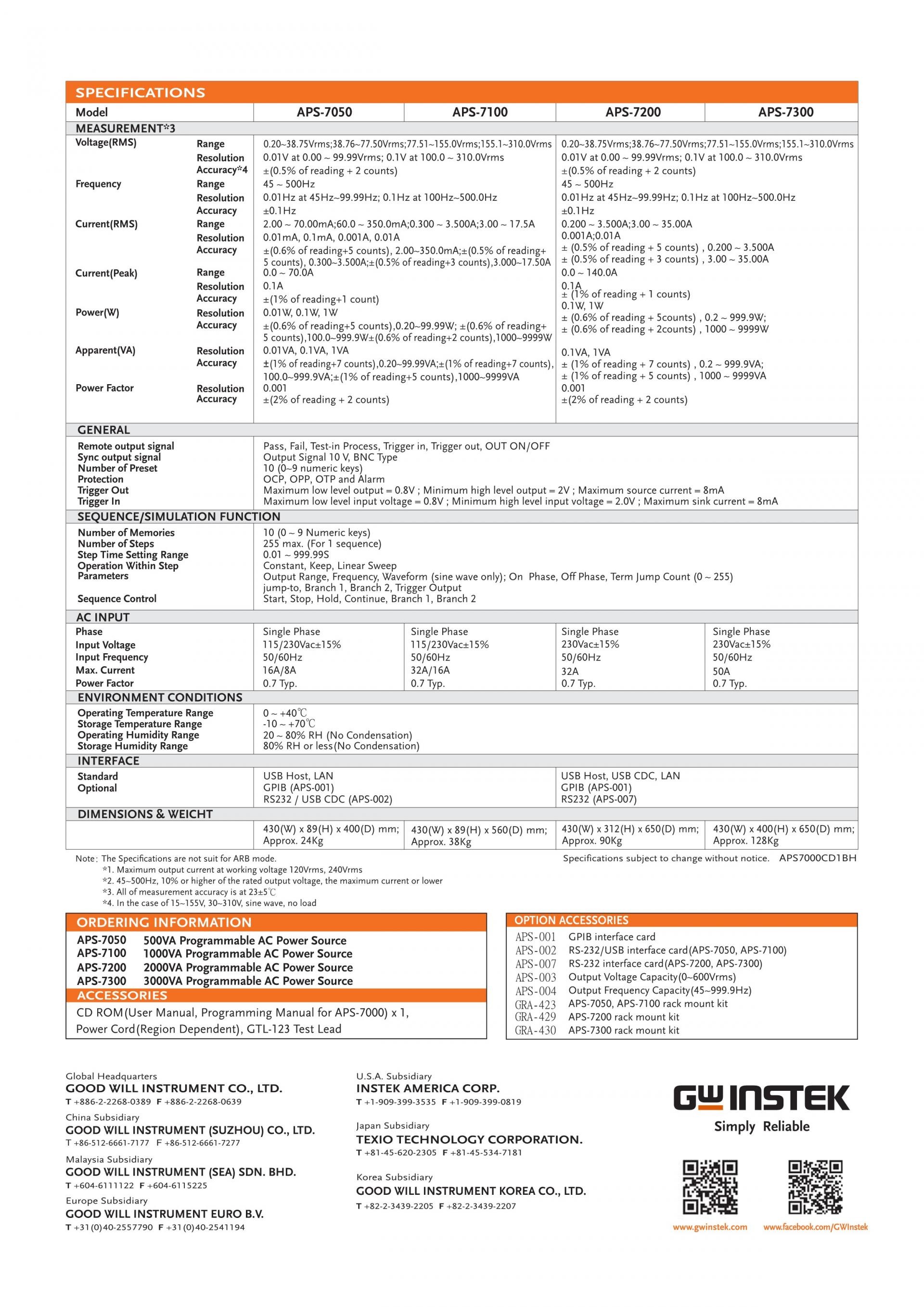 GWInstek introduces APS-7000 series programmable AC power sources, which consists of 500VA of APS-7050, 1000VA of APS-7100, 2000VA of APS-7200 and 3000VA of APS-7300. APS-7000 series features power characteristics from its linear structure design including low noise, low THD, and highly stabilized power output that are ideal for the product development and verification of input power with low noise requirement or stereo, video and audio device applications, etc. The maximum rated voltage is 0~ 310Vrms, 25.2Arms, 100.8A peak current and the output frequency range is 45~500.0Hz. Users can conveniently augment the output voltage from 0Vrms to 600Vrms and output frequency from 45Hz to 999.9Hz by purchasing options without sending equipment back to GW Instek.