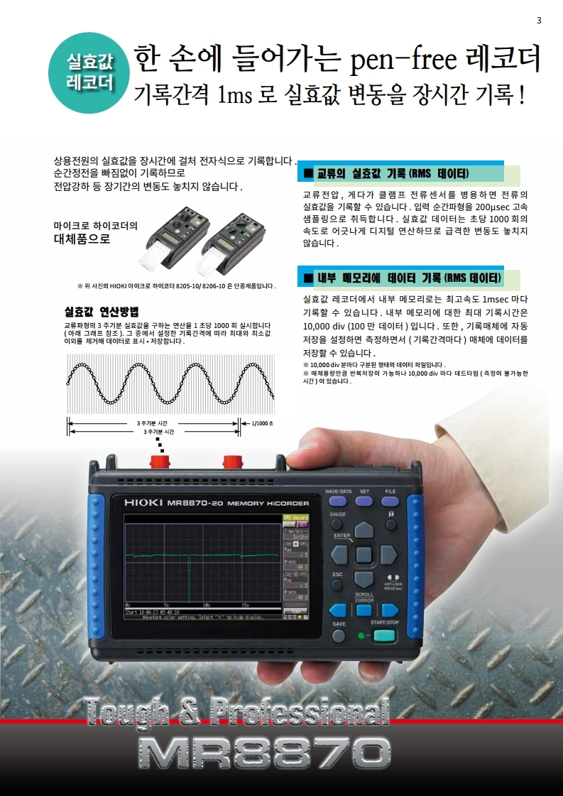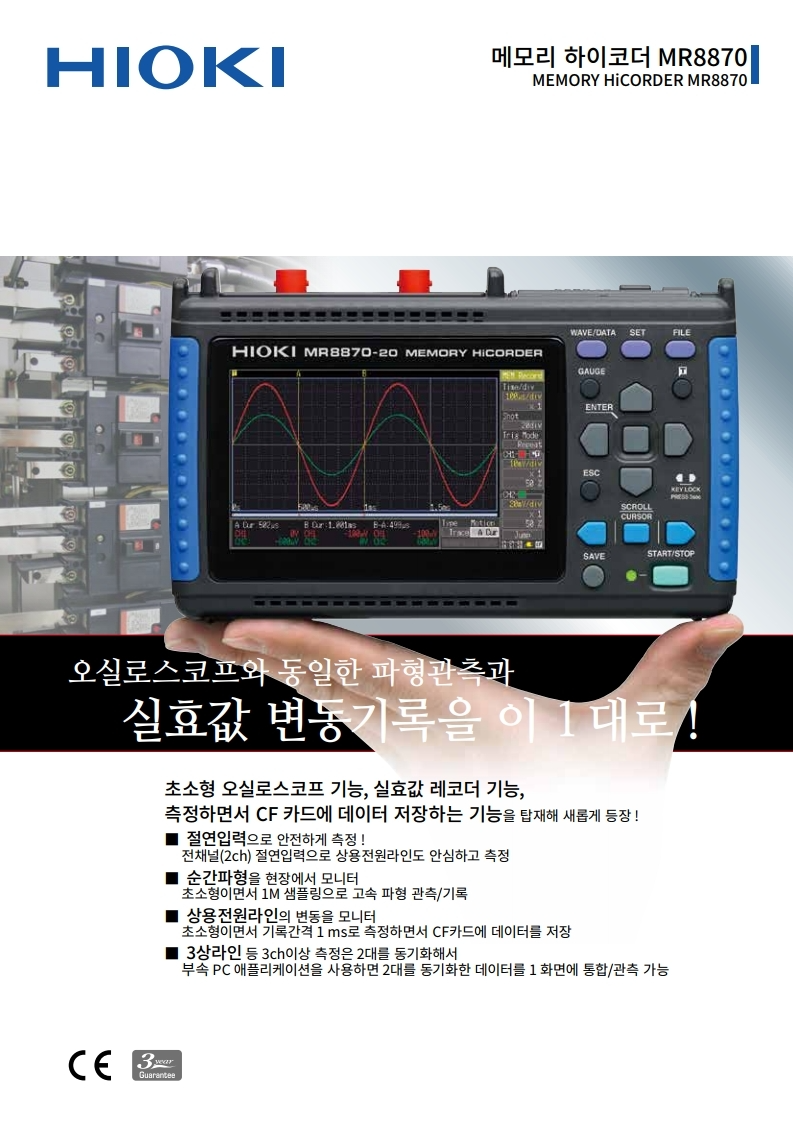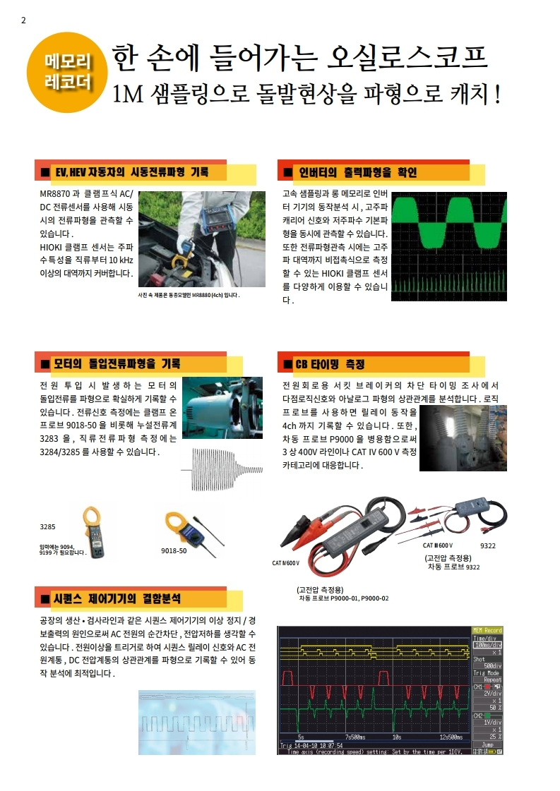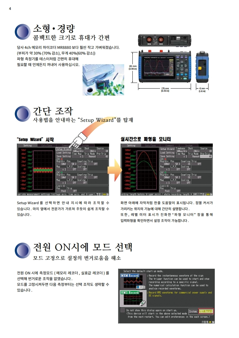 ● 순간 파형모드와 , 실효값 변동의 기록모드를 탑재