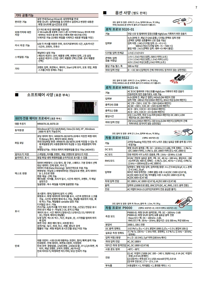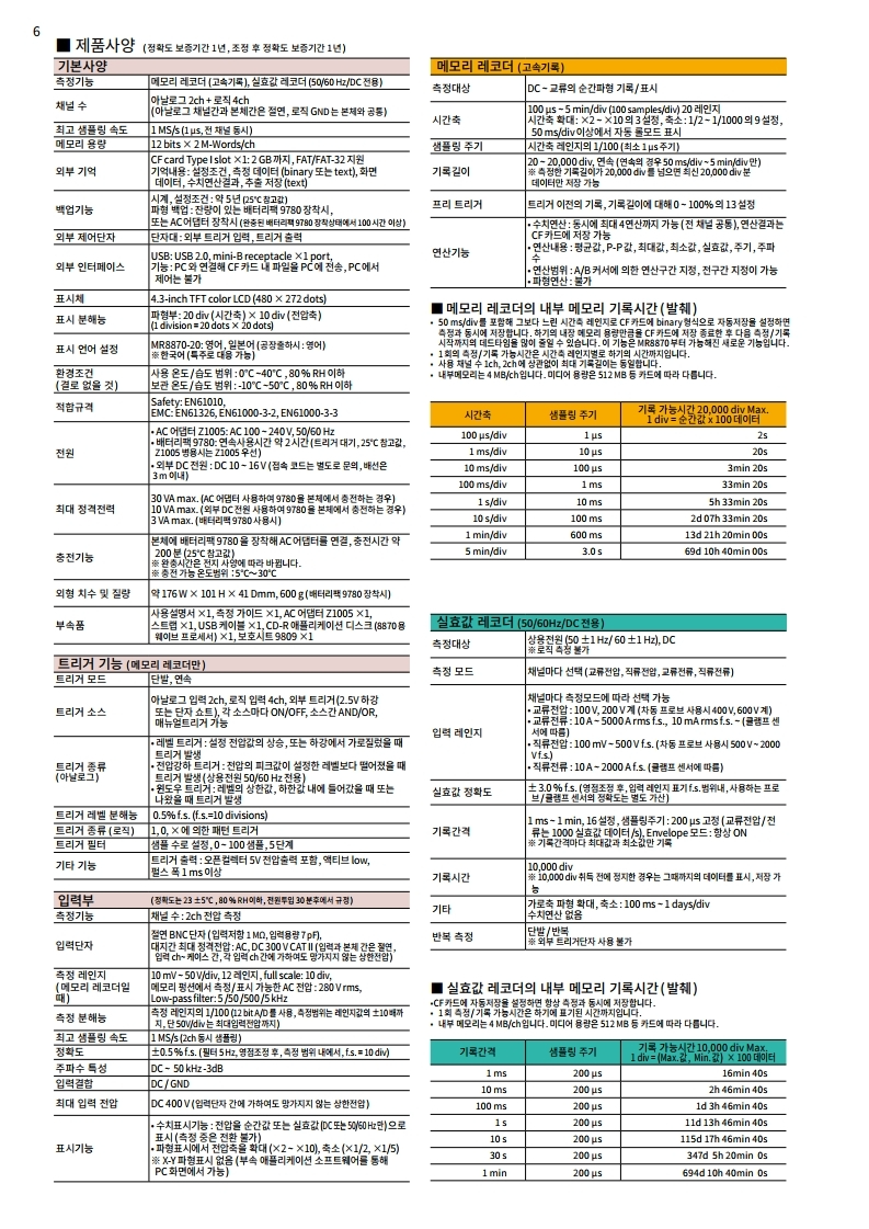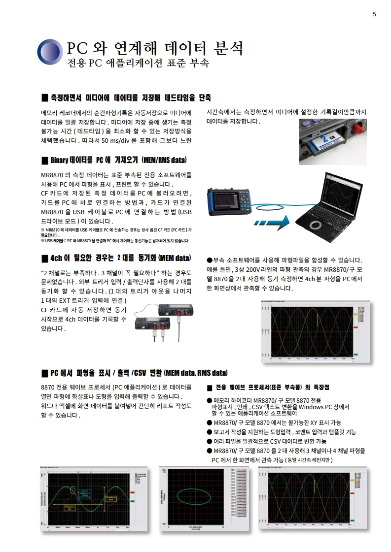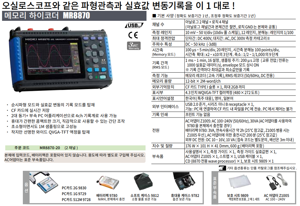● 순간 파형모드와 , 실효값 변동의 기록모드를 탑재