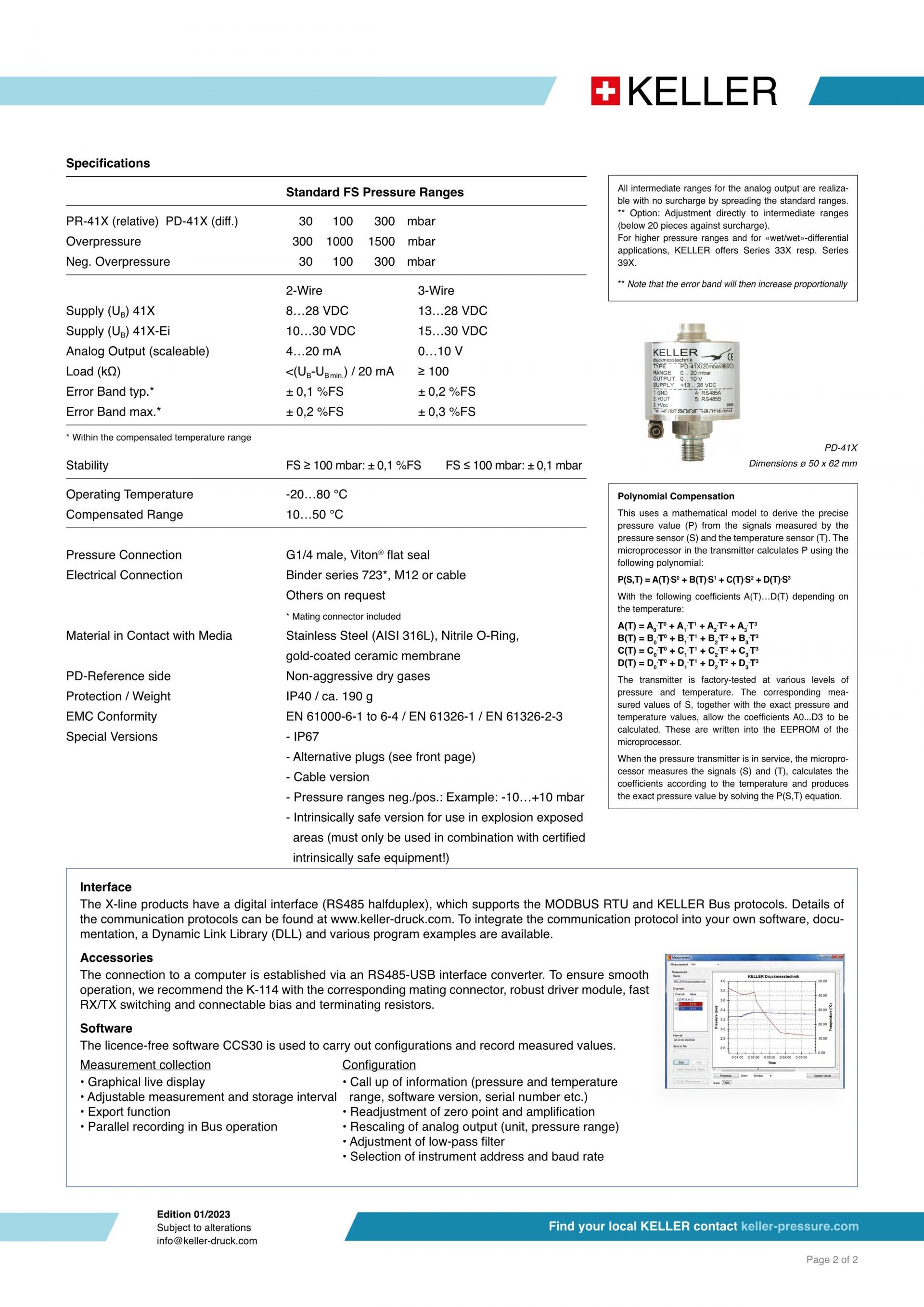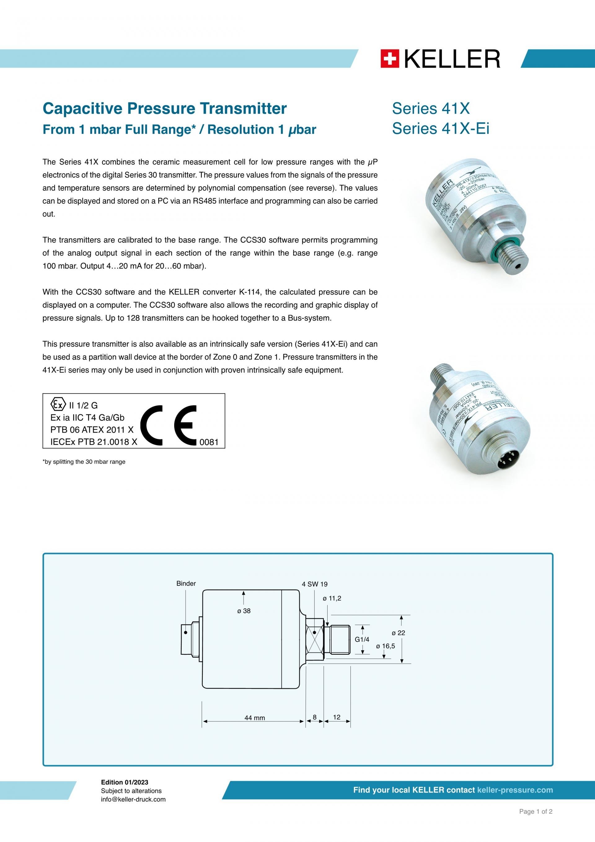 Series 41X는 저압 범위 용 세라믹 측정 셀과 디지털 Series 30 트랜스미터의 μP 전자 장치를 결합합니다. 압력 및 온도 센서 신호의 압력 값은 다항식 보상에 의해 결정됩니다. 이 값은 RS485 인터페이스를 통해 PC에 표시 및 저장할 수 있으며 프로그래밍도 수행 할 수 있습니다.